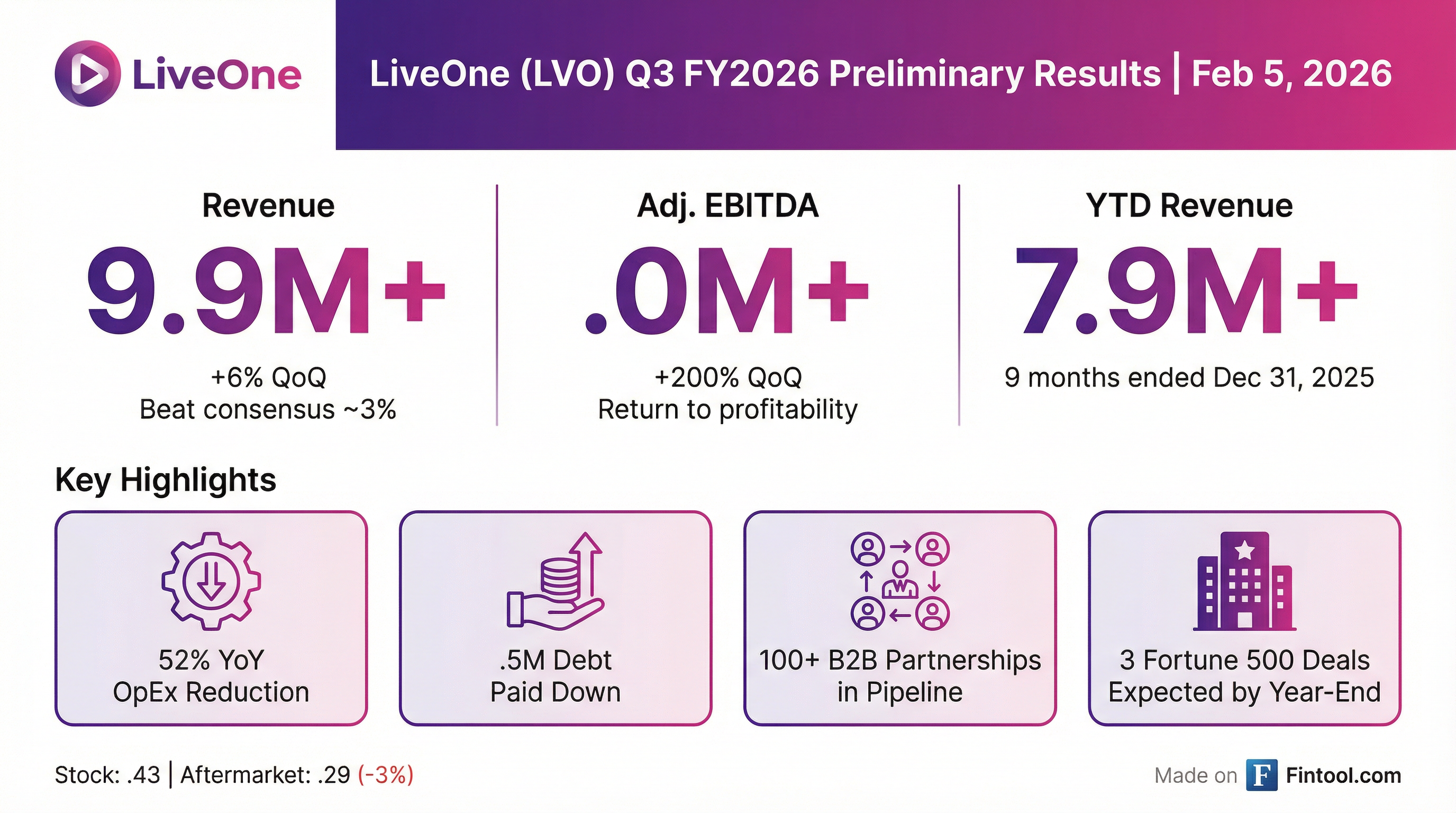 - LiveOne, Inc. expects preliminary revenue of over $19.9 million for Q3 Fiscal 2026 and over $57.9 million year-to-date for Fiscal 2026.