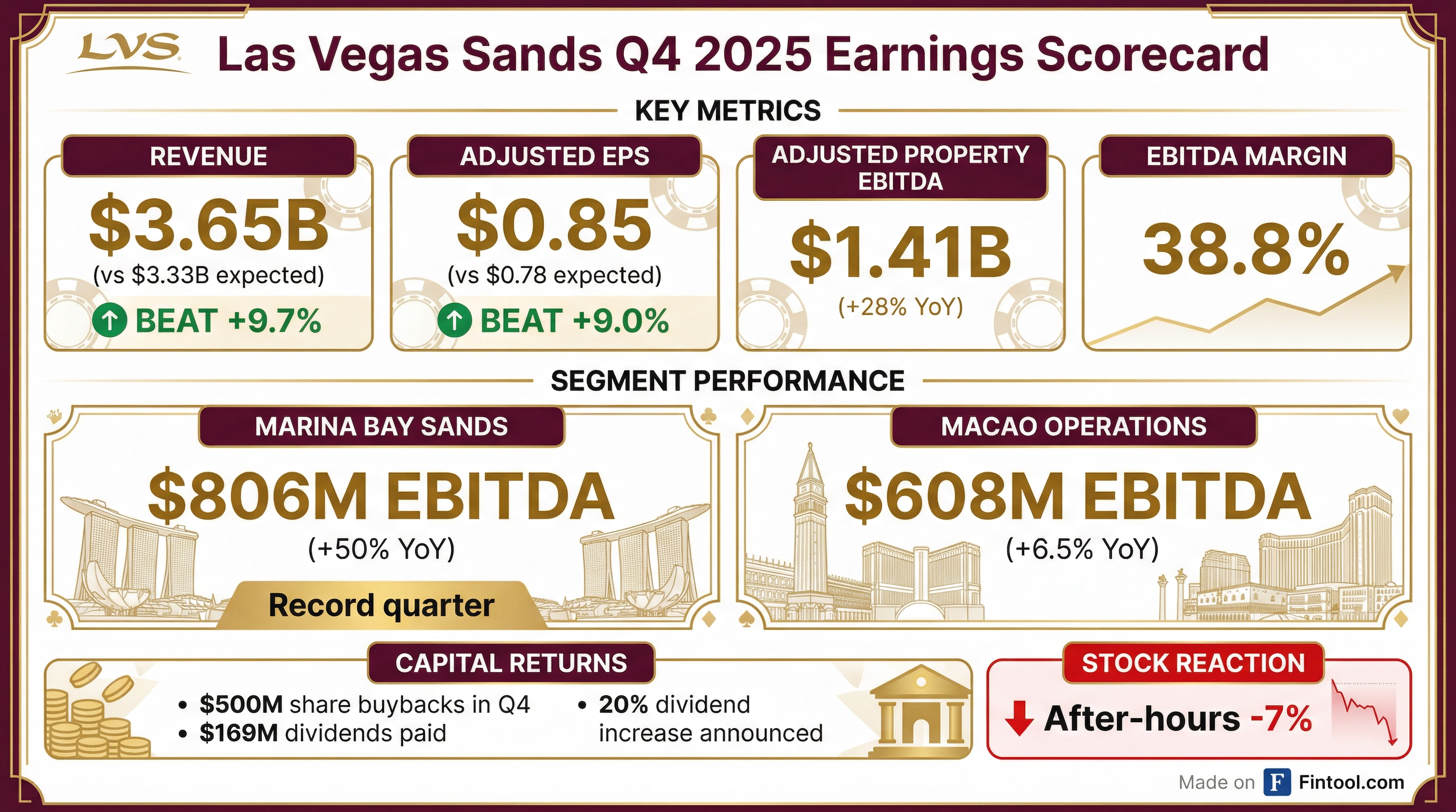 • Net revenue of $3.649 billion in Q4 2025, up $753 million y-o-y; net income attributable to LVS of $395 million and diluted EPS of $0.58 per share.