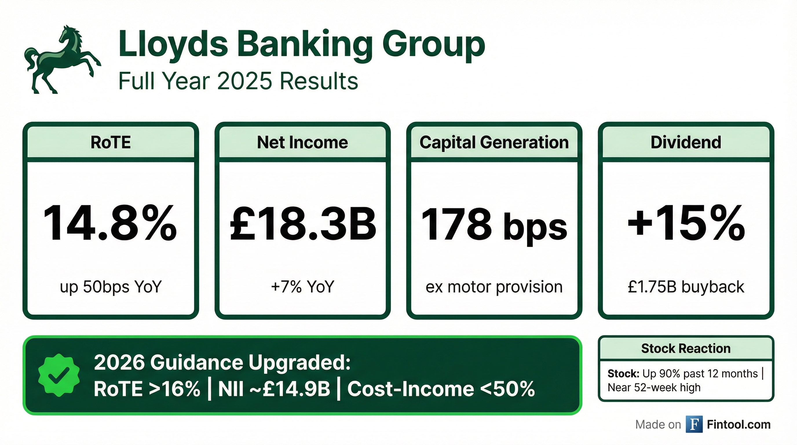 - Lloyds Banking Group reported strong full-year 2025 results with statutory profit after tax of GBP 4.8 billion and a return on tangible equity of 14.8% (excluding the Q3 motor provision). Net income grew 7% to GBP 18.3 billion, driven by 6% growth in Net Interest Income (NII) to GBP 13.6 billion and 9% growth in Other Operating Income (OOI).