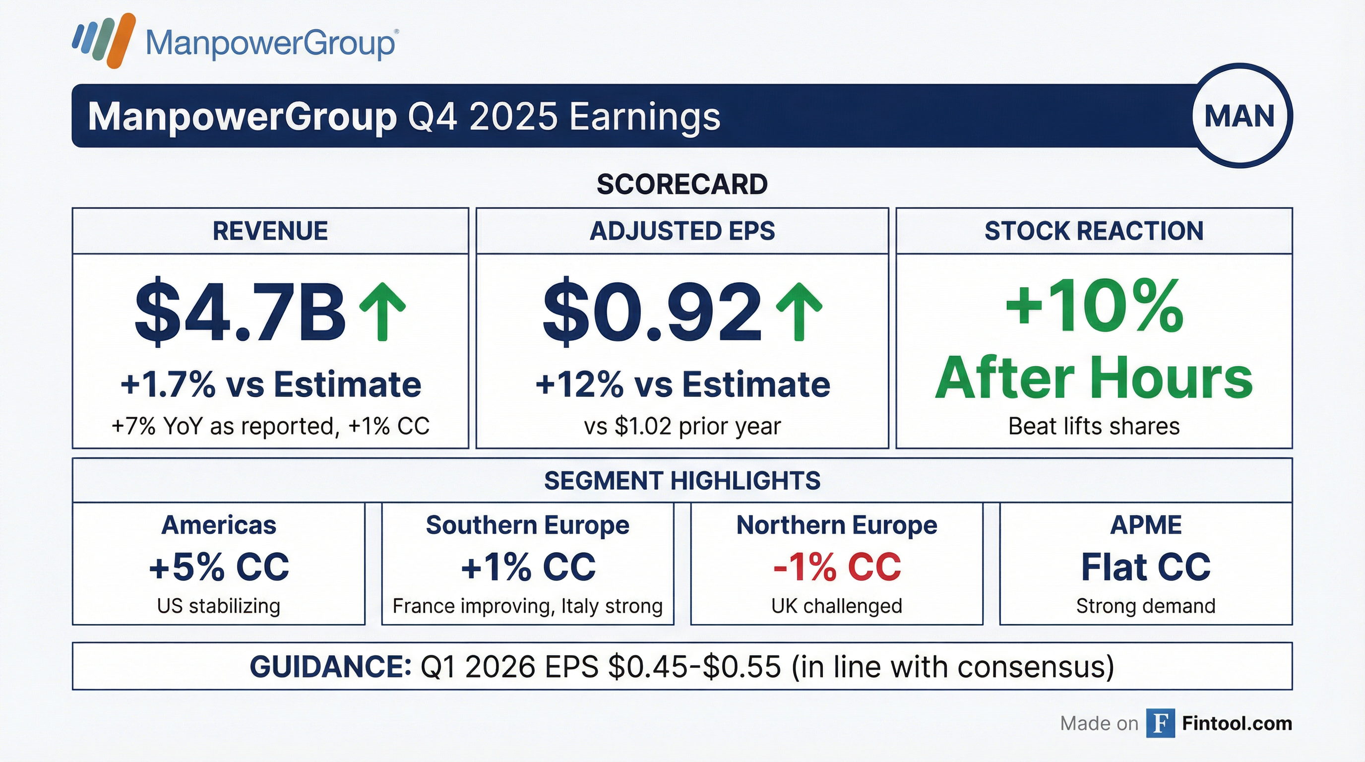 - ManpowerGroup reported Q4 2025 revenue of $4.7 billion (systemwide $5.1 billion) and adjusted EPS of $0.92.