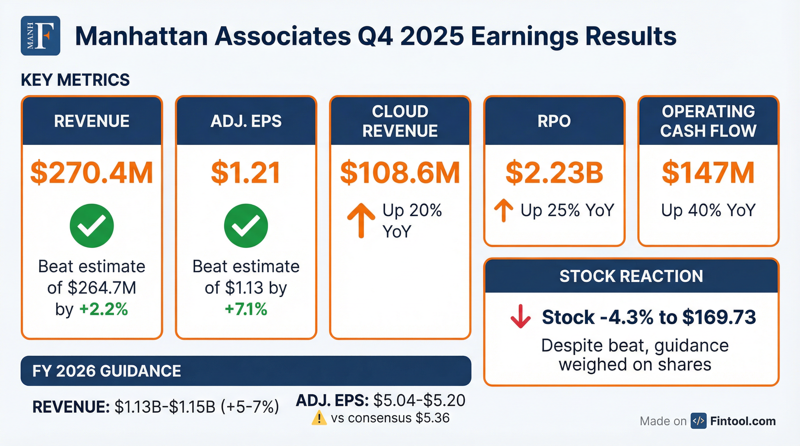- Manhattan Associates achieved record financial results for full-year 2025, with total revenue of $1.08 billion (up 4%), cloud revenue of $408 million (up 21%), and adjusted earnings per share of $5.06 (up 7%). The company also reported record cloud bookings in Q4 2025 and ended the year with $2.2 billion in Remaining Performance Obligations (RPO), marking a 25% year-over-year increase.