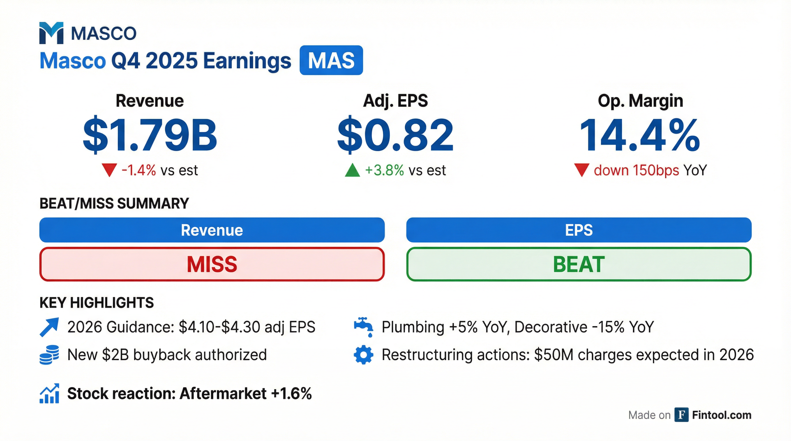 - Masco reported Q4 2025 net sales down 2%, operating profit of $259 million (14.4% margin), and EPS of $0.82 per share.