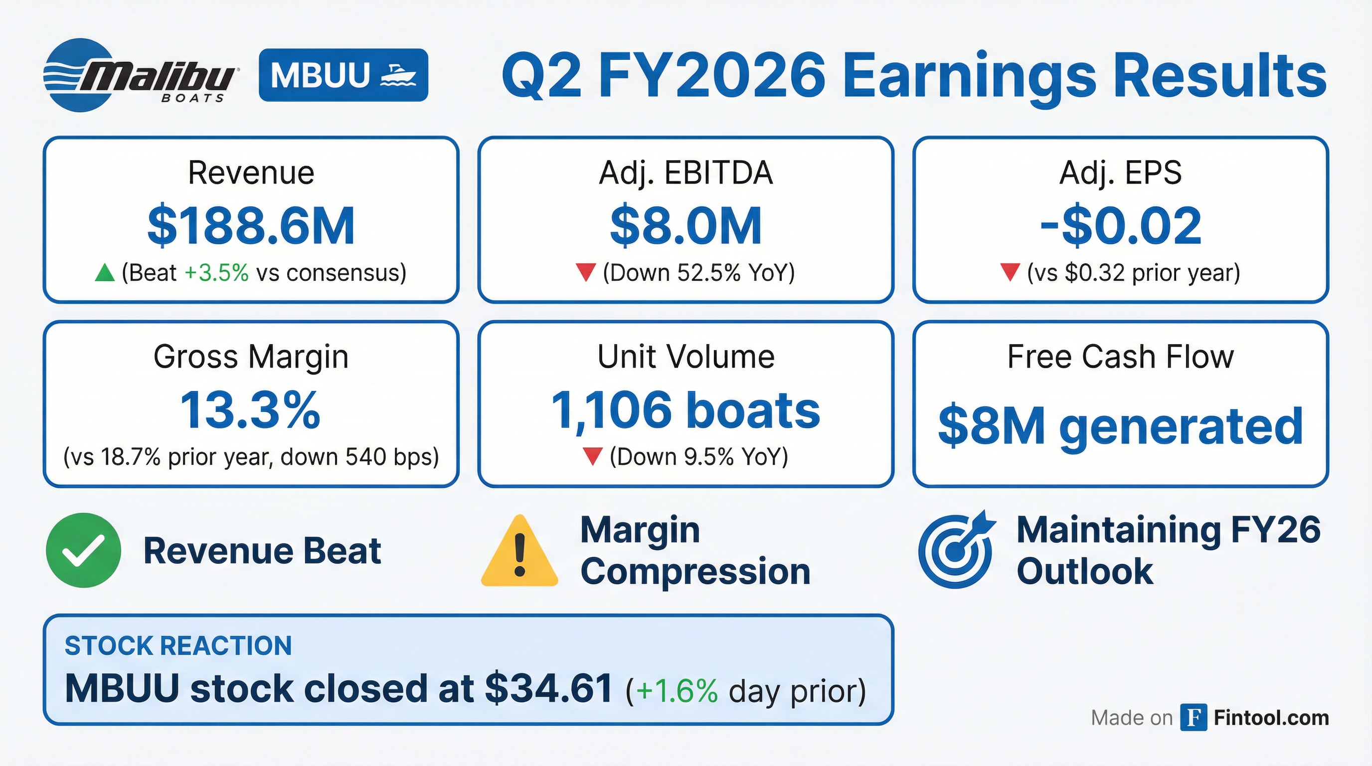 - Malibu Boats reported net sales of $188.6 million for Q2 2026, a 5.8% decrease year-over-year, with adjusted EBITDA at $8 million, down 52.5%, leading to an adjusted net loss per share of $0.02.