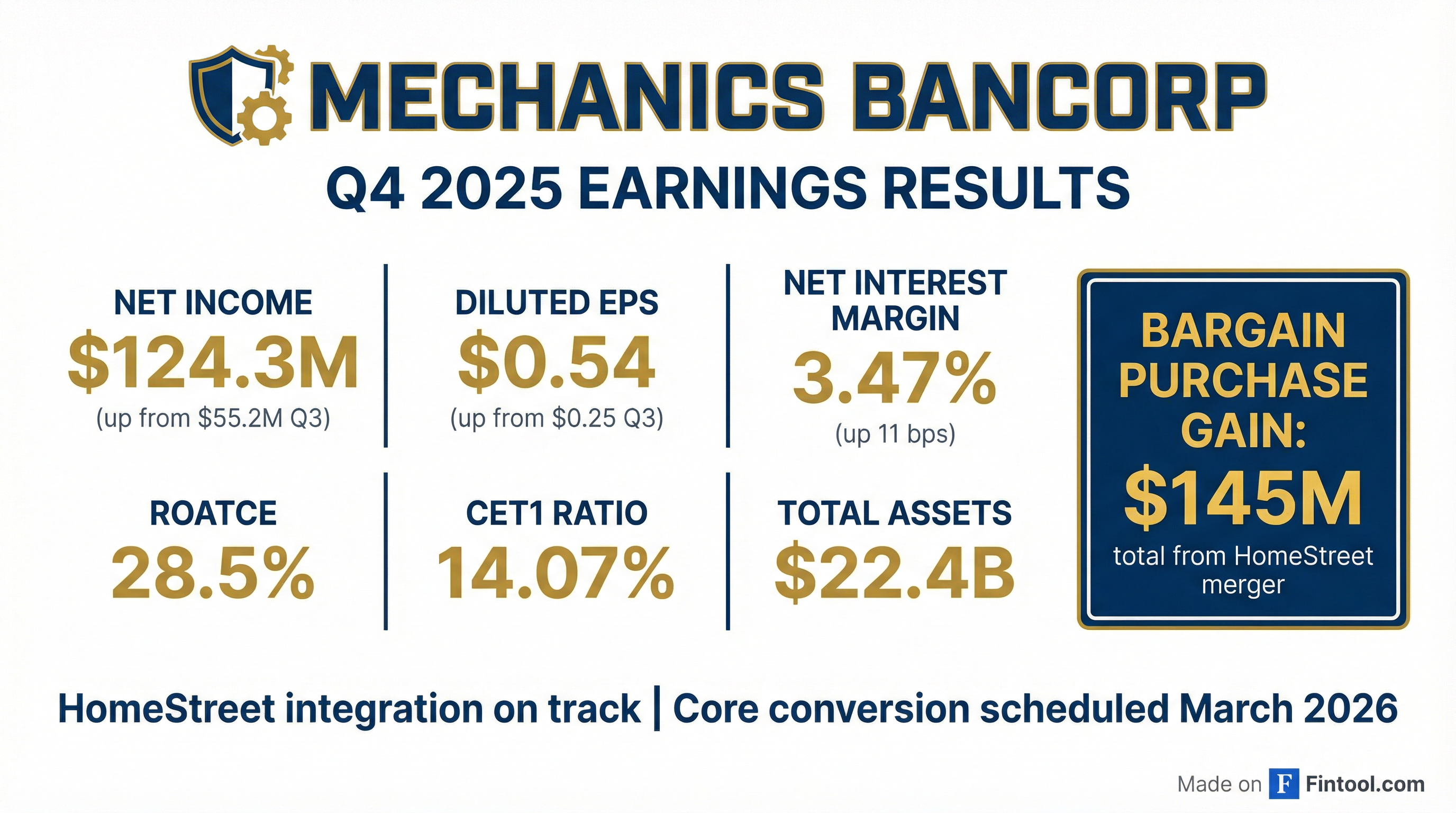 - Mechanics Bancorp reported net income of $124.3 million and diluted EPS of $0.54 for Q4 2025, with a Net Interest Margin (NIM) of 3.47%. Core net income, excluding one-time items, was just under $60 million.
