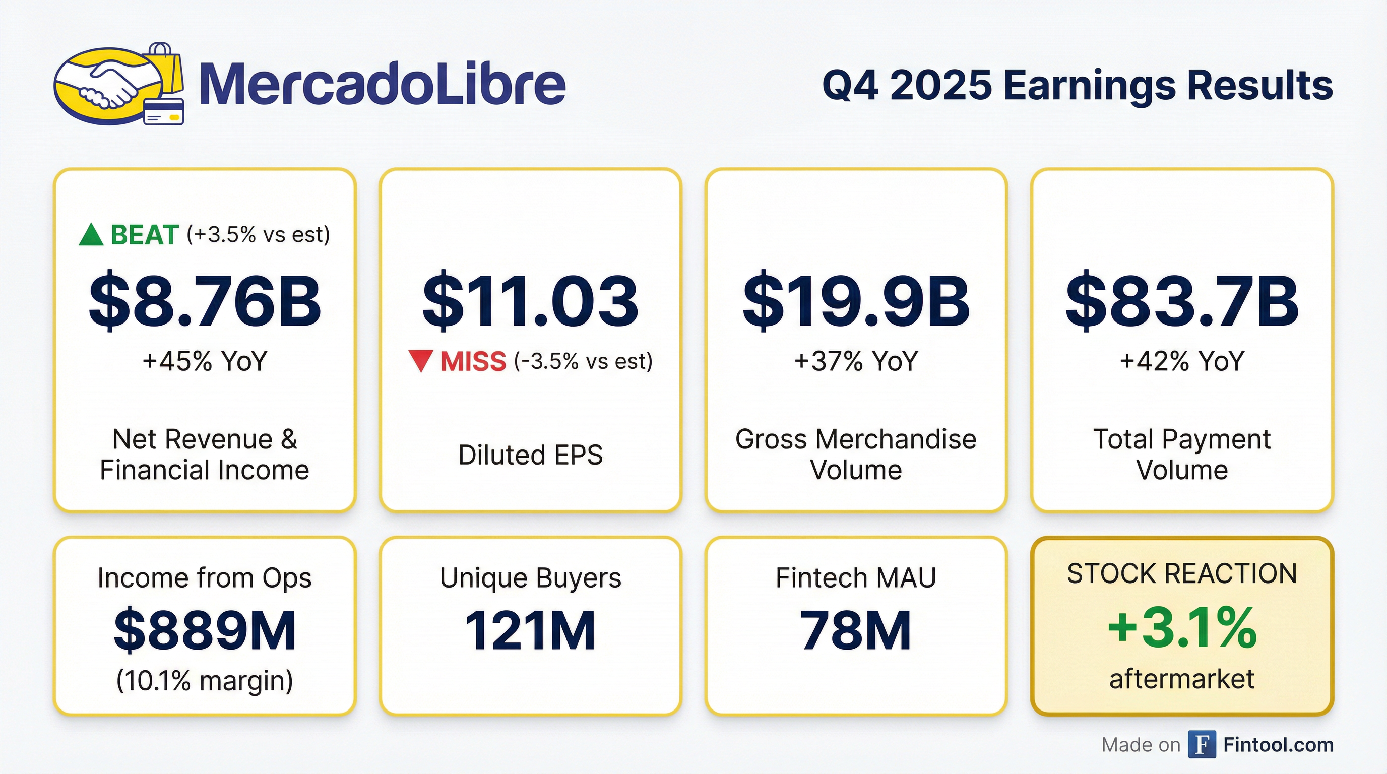 - Mercado Libre reported Q4 2025 net revenue and financial income of $8.8 billion, a 45% year-over-year increase, contributing to full-year 2025 net revenue of $28.9 billion, up 39% year-over-year.