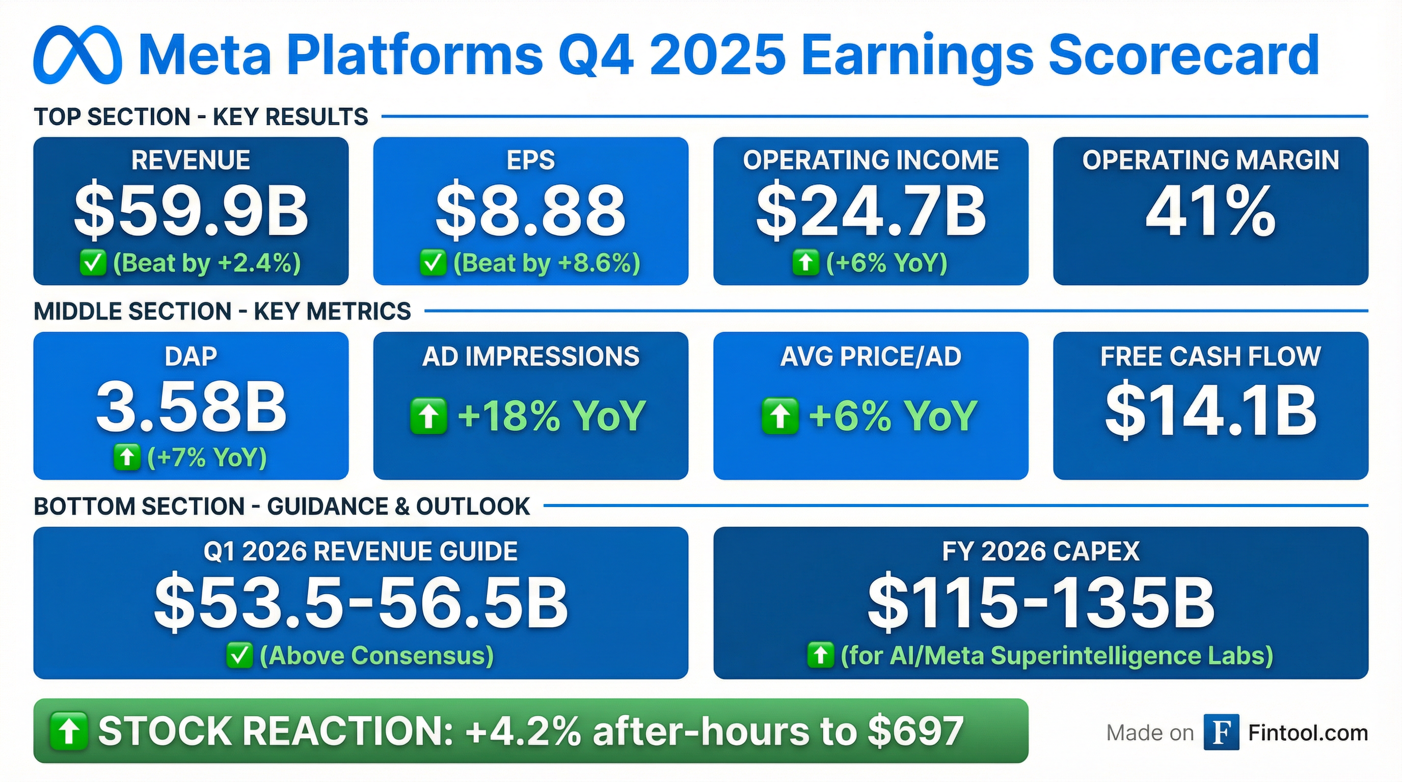 - Meta reported Q4 2025 total revenue of $59.9 billion with an operating margin of 41%.