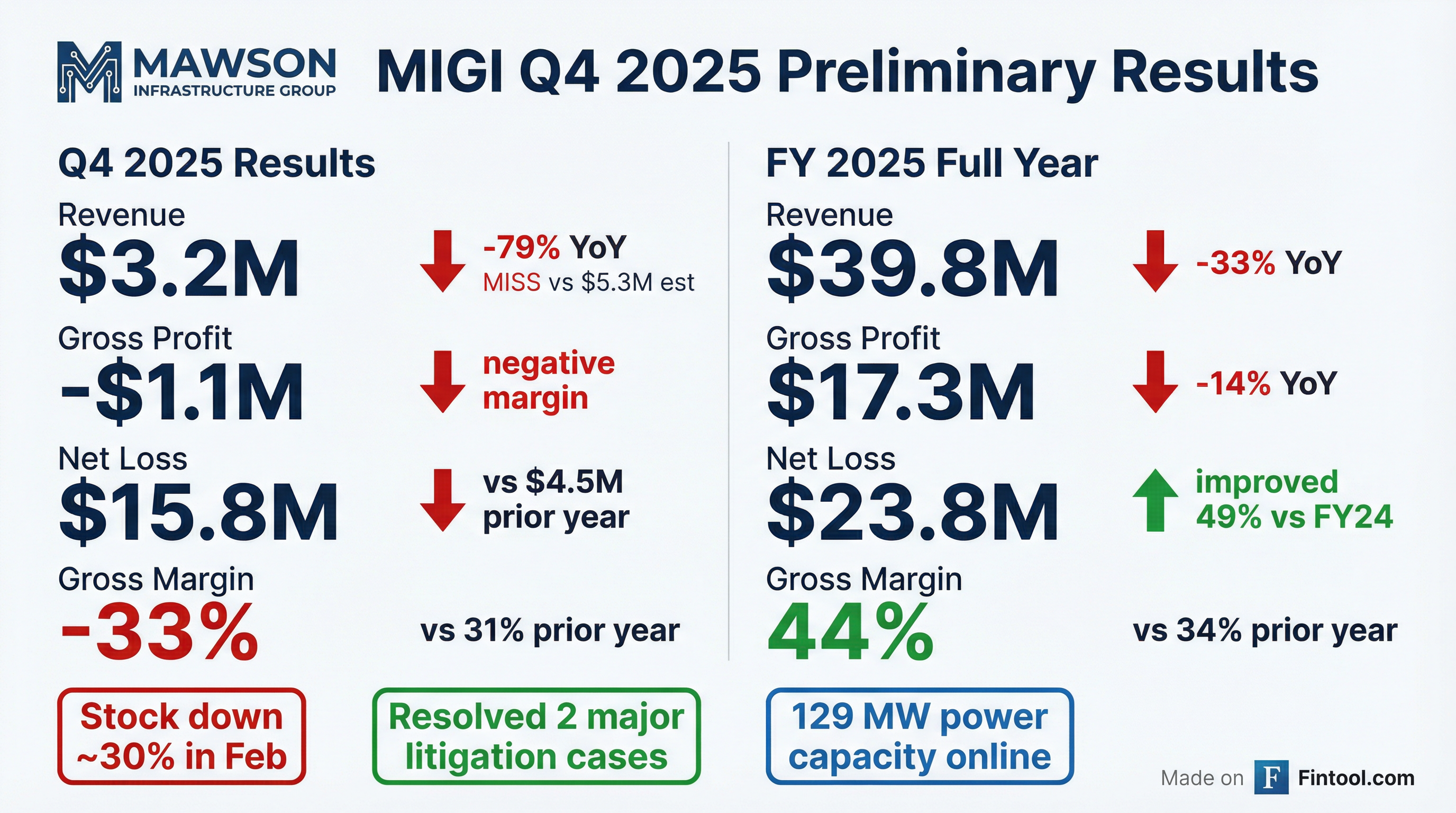 - Mawson Infrastructure Group (MIGI) released preliminary, unaudited financial results for the fourth quarter and fiscal year ended December 31, 2025.