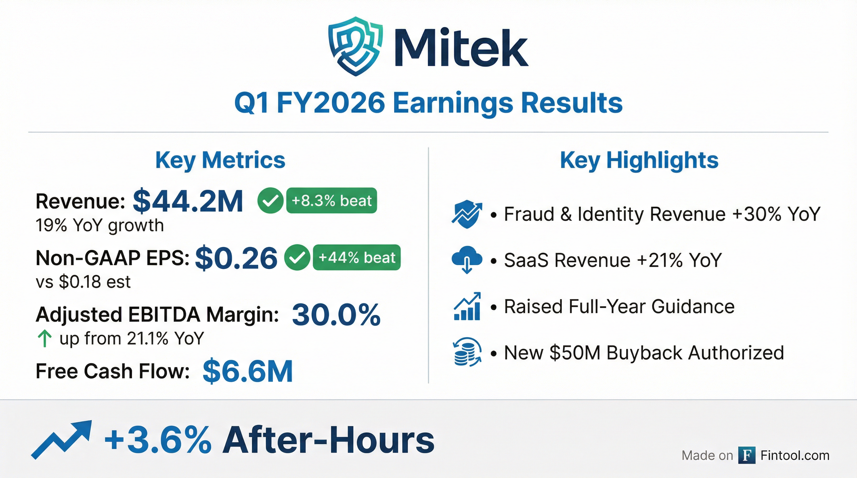 - Mitek reported Q1 FY26 Total Revenue of $44 million, marking a 19% year-over-year increase, with Fraud & Identity Solutions Revenue growing 30% to $25 million and SaaS Revenue increasing 21% to $22 million.