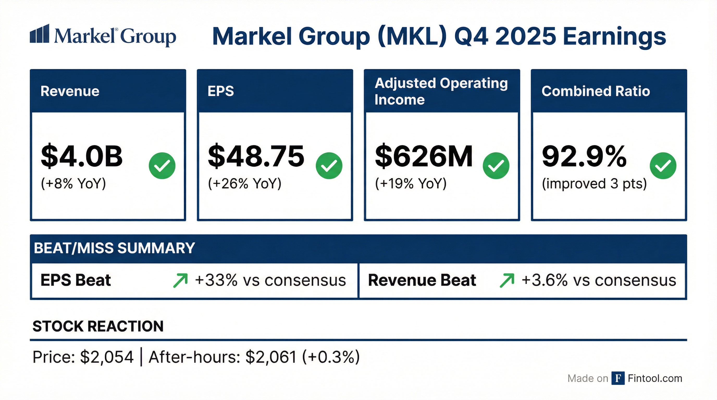 - Markel Group's consolidated operating revenues were up 8% for Q4 2025 and 5% for the full year 2025, with adjusted operating income increasing 19% to $626 million for the quarter and 10% to $2.3 billion for the full year.