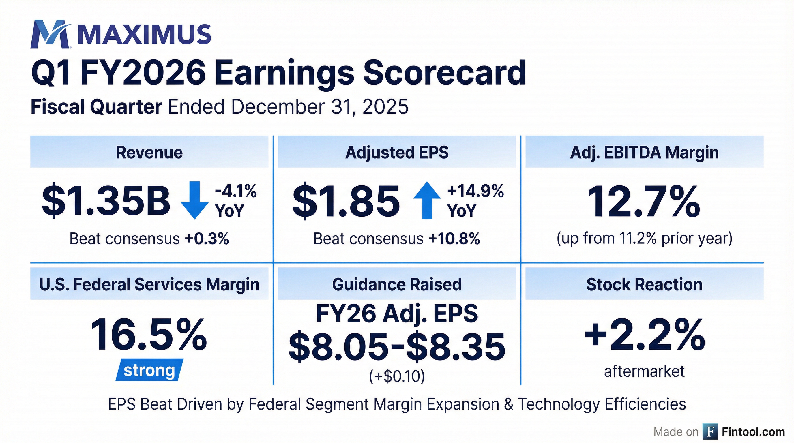 - Maximus reported Q1 FY2026 revenue of $1.35 billion, representing a 4.1% decline over the prior year period, with adjusted EPS of $1.85 and an adjusted EBITDA margin of 12.7%.