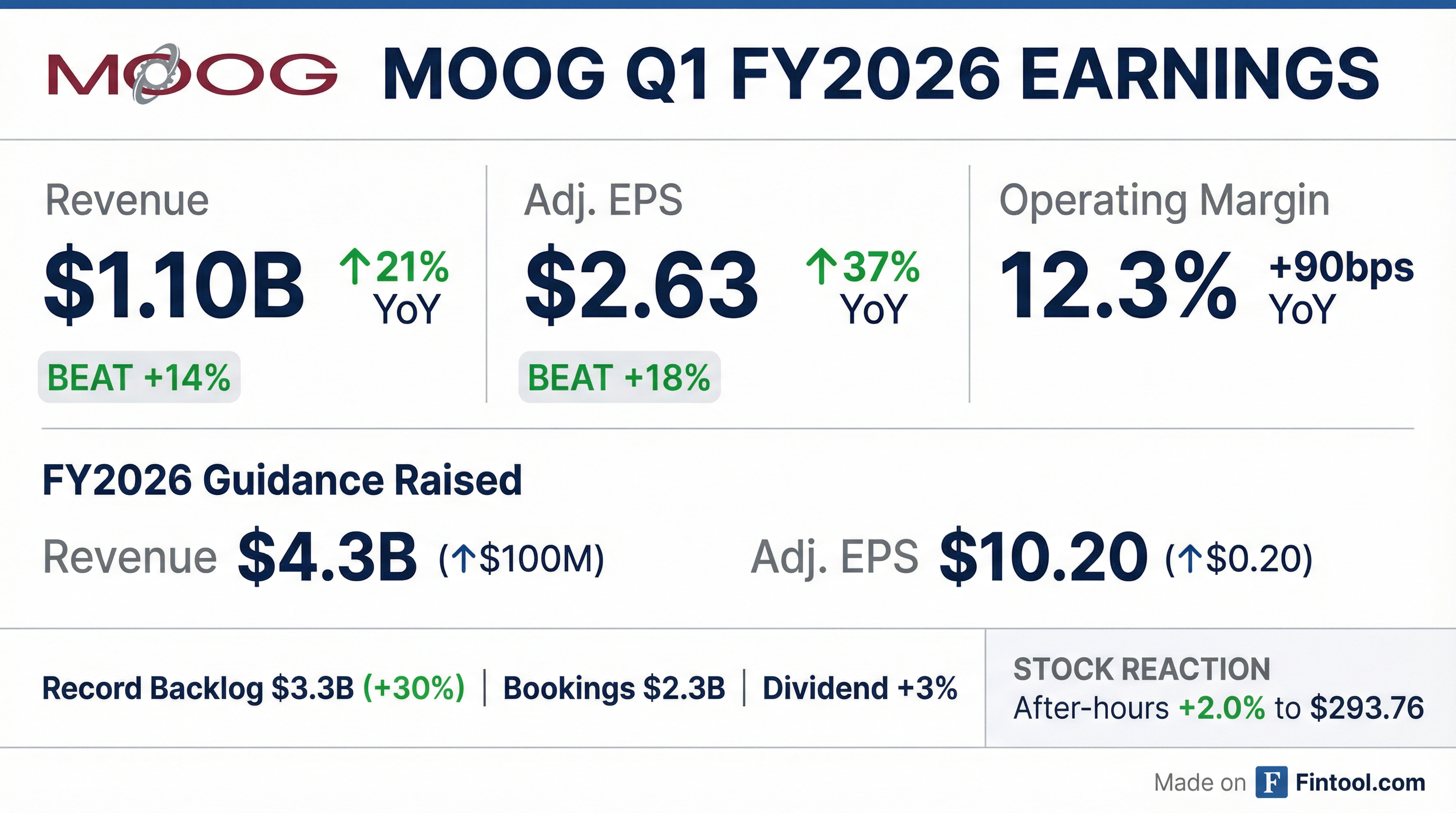 - Moog Inc. reported record fiscal first quarter 2026 net sales of $1,100 million, a 21% increase from Q1 2025, and record diluted net earnings per share of $2.46, a 38% increase.