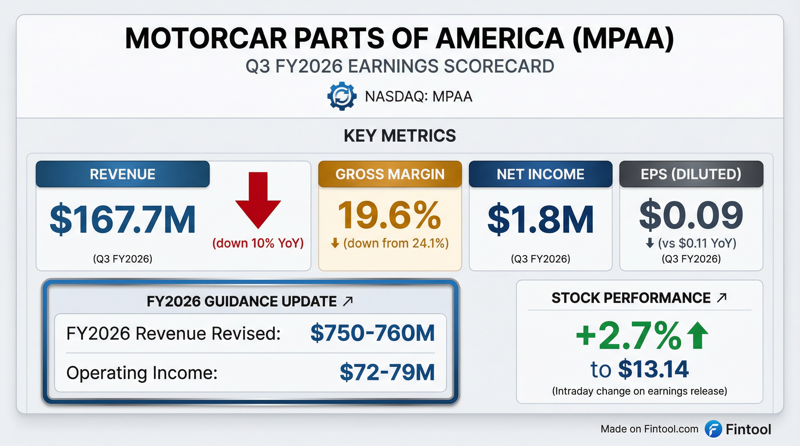 - Motorcar Parts of America reported fiscal Q3 2026 net sales of $167.7 million and net income of $1.8 million ($0.09 per diluted share), primarily impacted by an approximately $17 million sales decrease from a large customer.