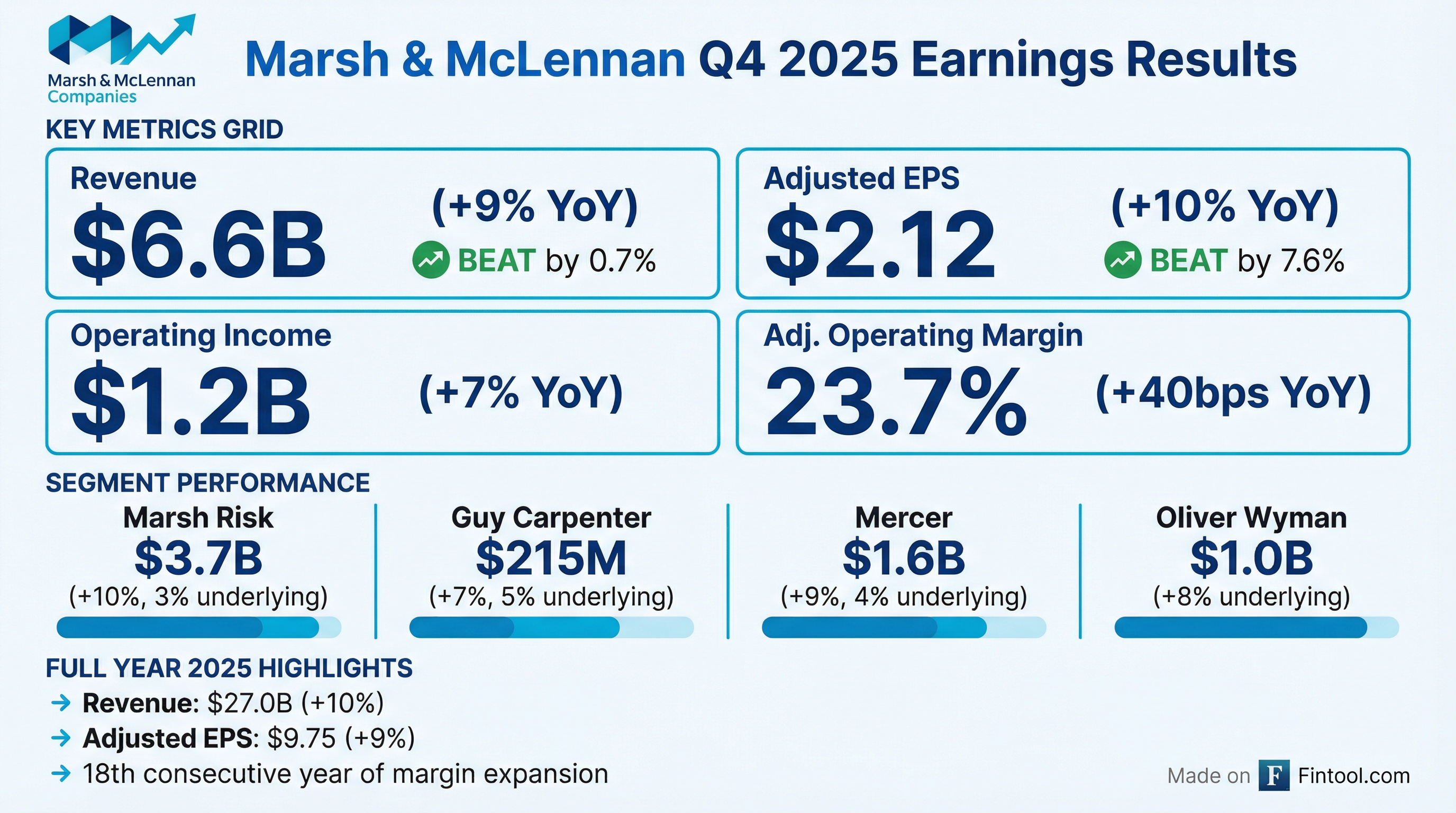 - Marsh reported full-year 2025 revenue of $27.0 billion, a 10% GAAP increase, with GAAP EPS of $8.43 and Adjusted EPS of $9.75, marking a 9% increase.