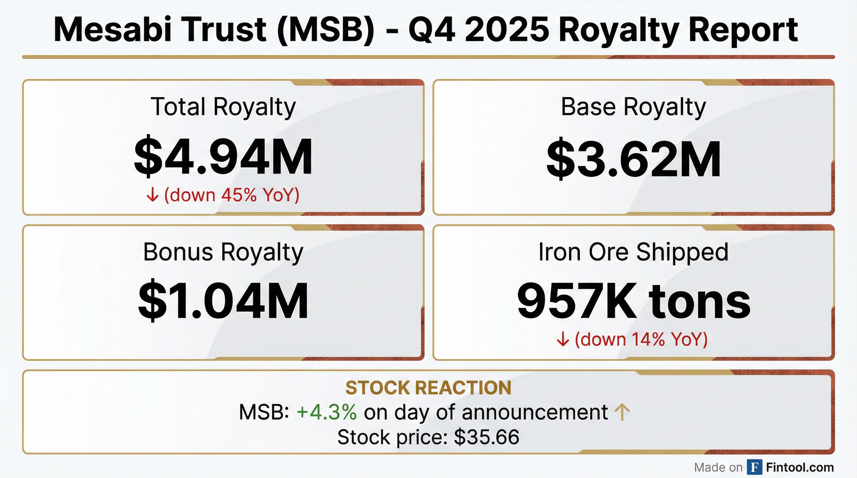 - Mesabi Trust received $4,943,488 in total royalty payments from Cleveland-Cliffs Inc. on January 30, 2026, for the quarter ended December 31, 2025.