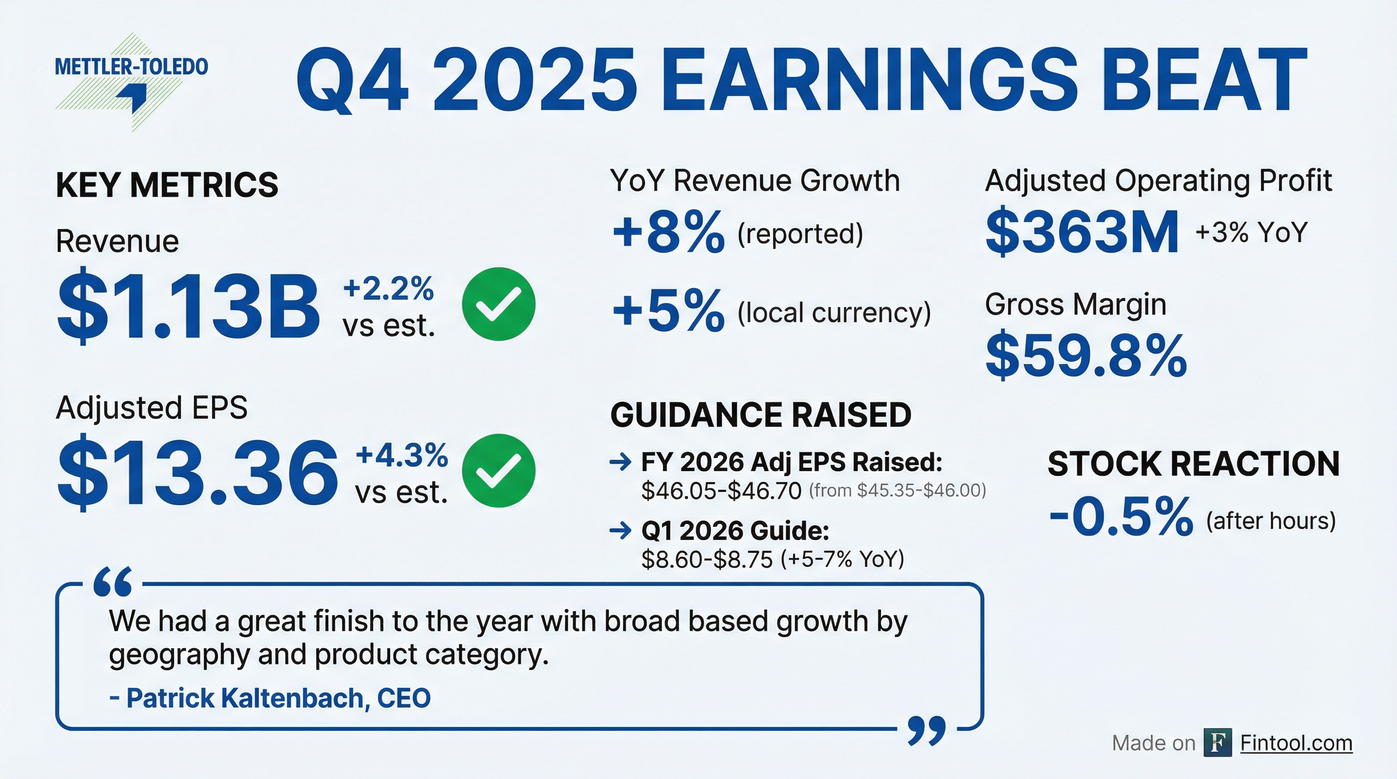 - Mettler-Toledo’s Q4 2025 net sales increased 8% to $1.130 billion; GAAP EPS were $13.98, and non-GAAP adjusted EPS were $13.36 (+8%).
