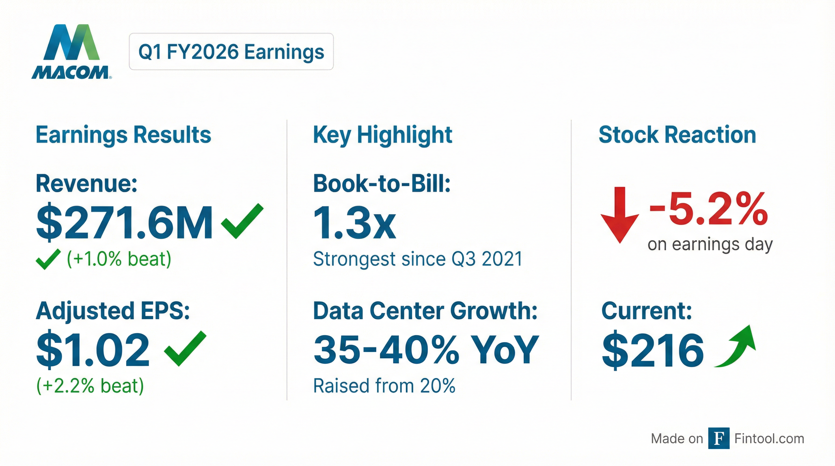 - For fiscal Q1 2026, MACOM Technology Solutions Holdings Inc. reported revenue of $271.6 million and adjusted EPS of $1.02 per diluted share, with a book-to-bill ratio of 1.3-to-1.