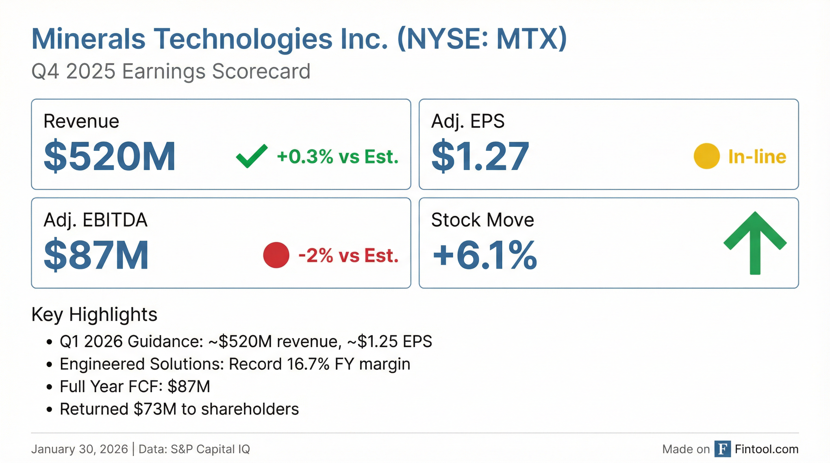 - Minerals Technologies Inc. reported fourth quarter 2025 earnings per share of $1.19, or $1.27 excluding special items, on worldwide net sales of $519.5 million.