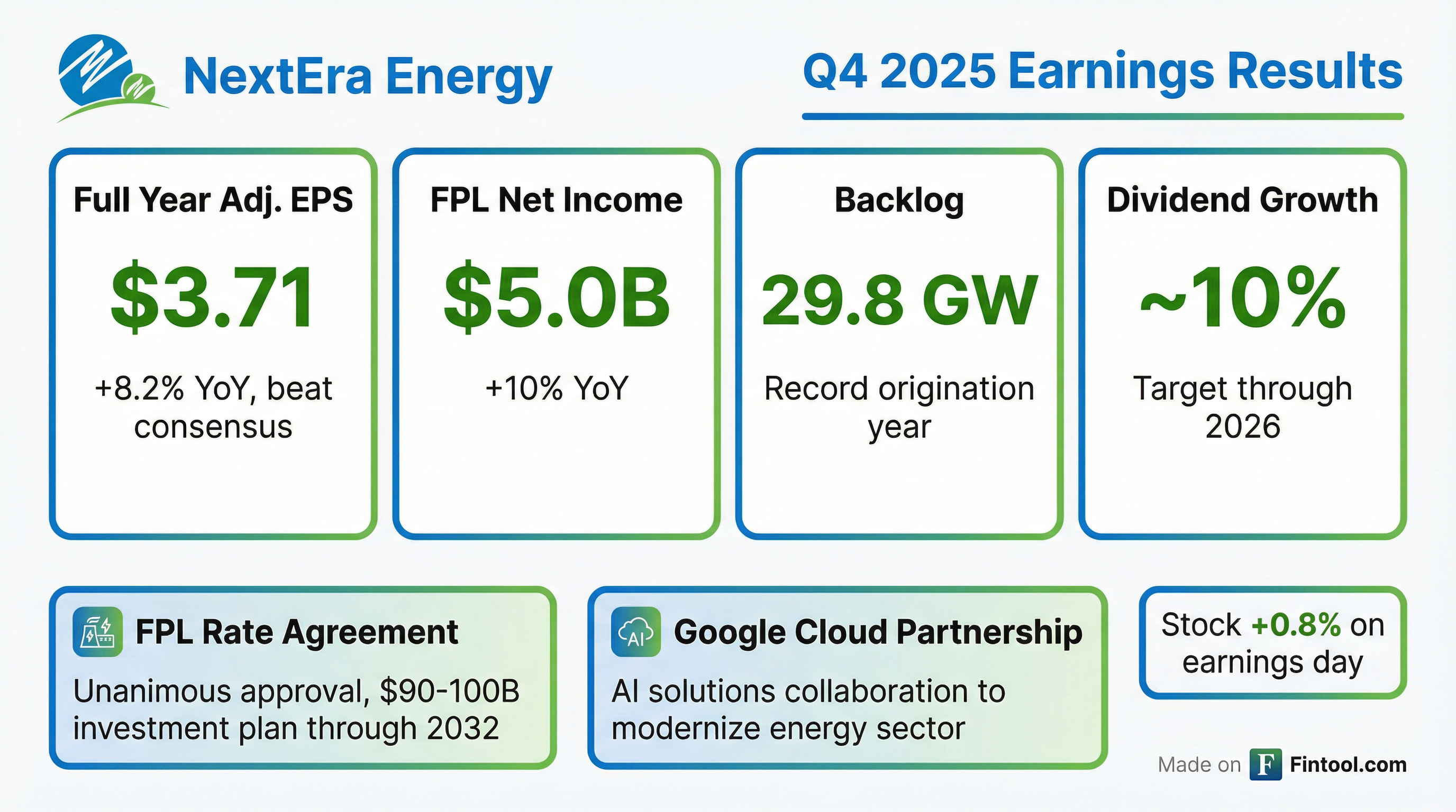 - NextEra delivered full-year adjusted EPS of $3.71, up over 8% from 2024, and maintains 2026 guidance of $3.92–$4.02 per share.