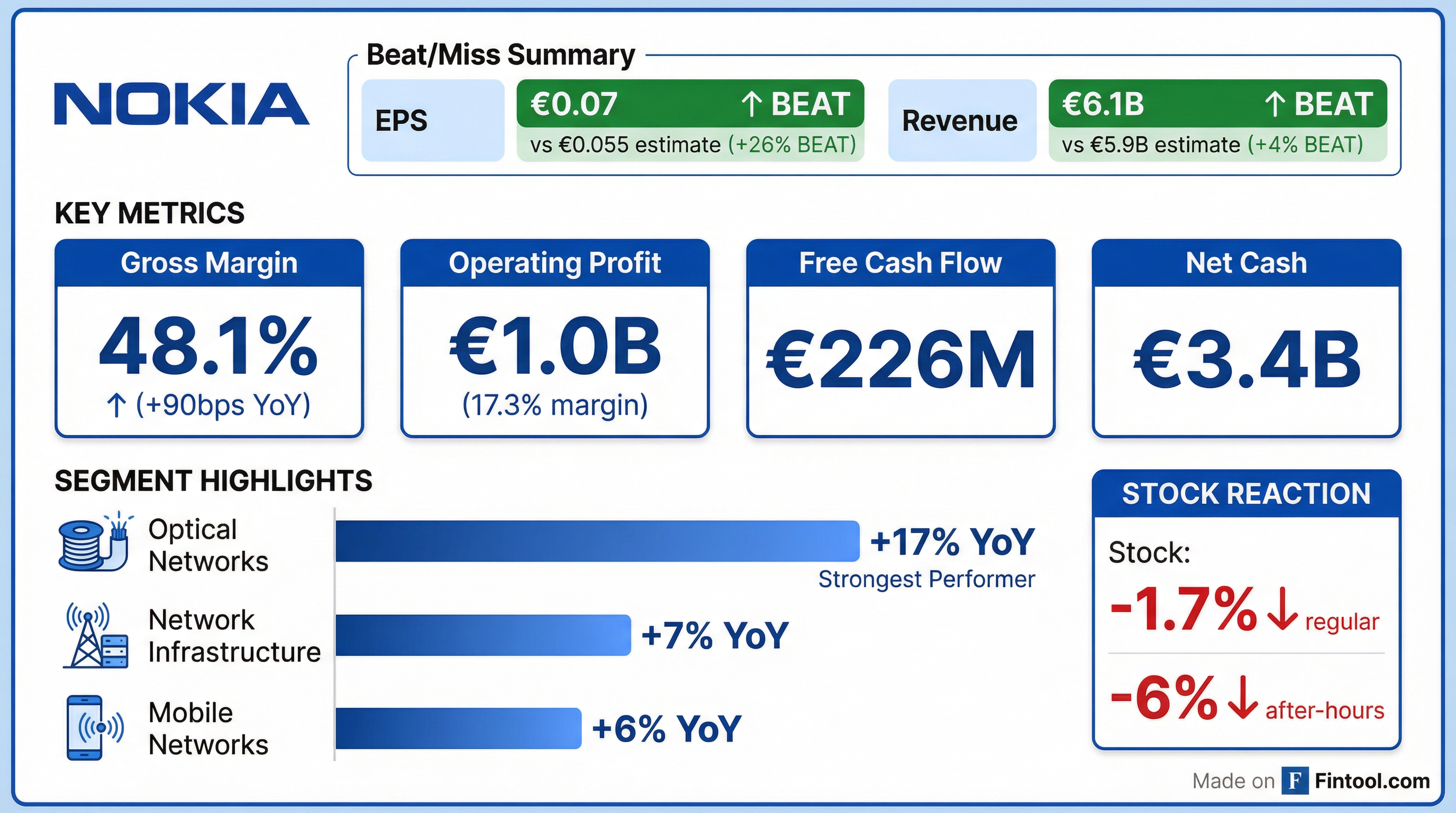 - Nokia reported Q4 2025 net sales of EUR 6.1 billion, a 3% increase year-over-year, with an operating profit of EUR 1 billion and EUR 0.2 billion in free cash flow. For the full year 2025, net sales reached EUR 19.9 billion and operating profit was EUR 2 billion, aligning with guidance.
