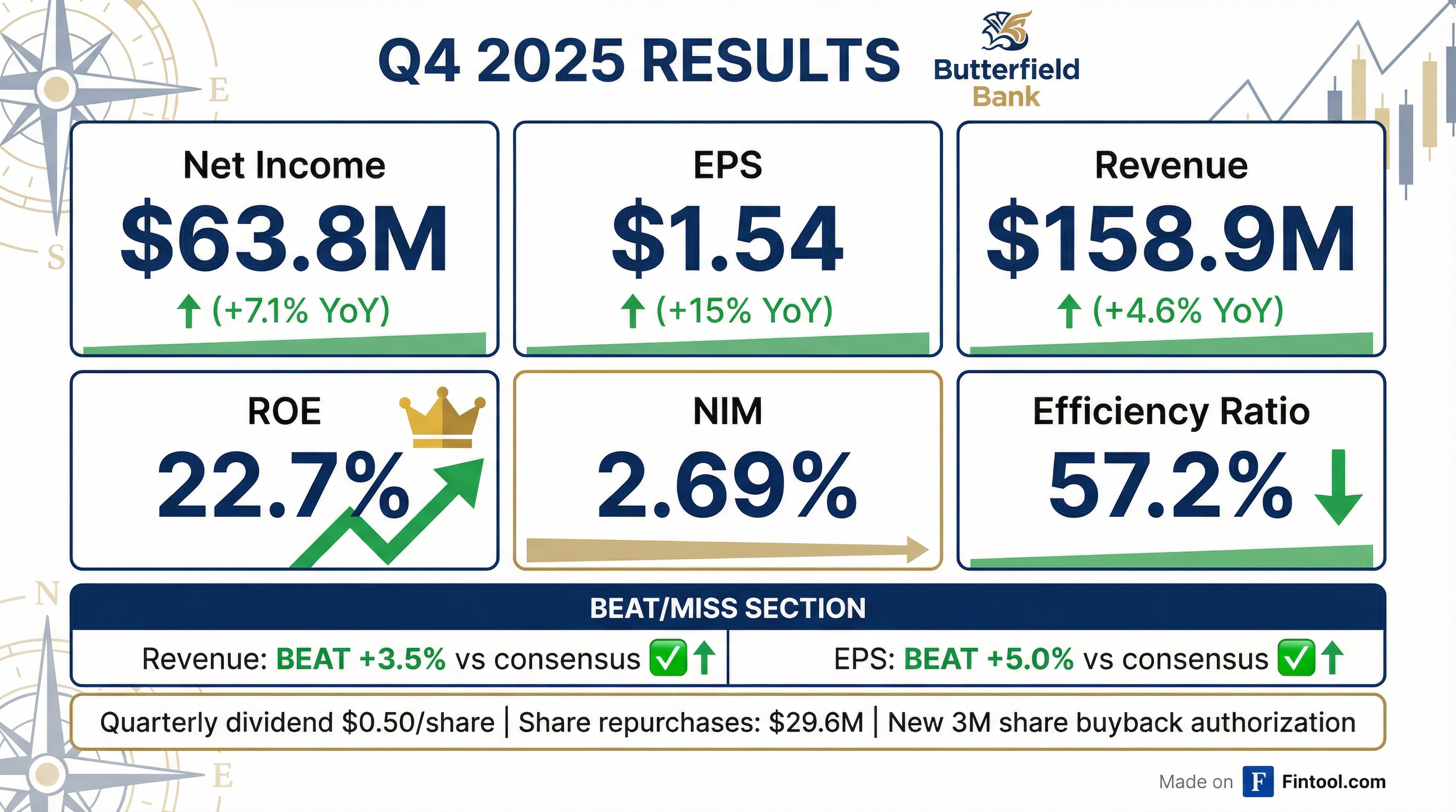 - Butterfield delivered strong financial results in 2025, with core net income per share growing 17.4% year on year to $5.60 and a core return on average tangible common equity of 24.2%. For Q4 2025, net income and core net income were $63.8 million, with EPS of $1.54.