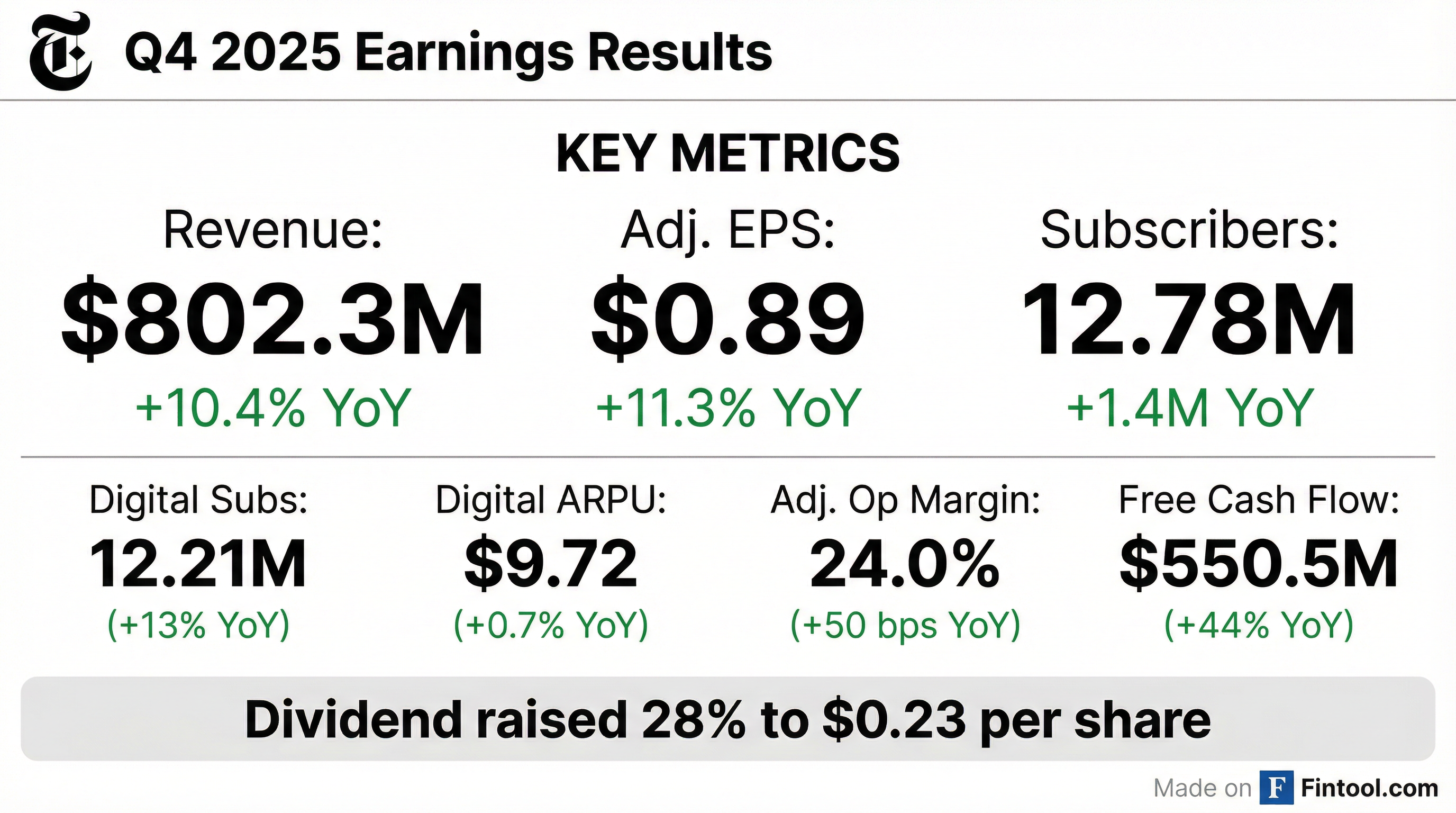 - The company added approximately 450,000 net digital-only subscribers in Q4 2025, bringing the total number of subscribers to 12.78 million, including 12.21 million digital-only subscribers. Digital subscription revenues increased 13.9% year-over-year to $381.5 million.