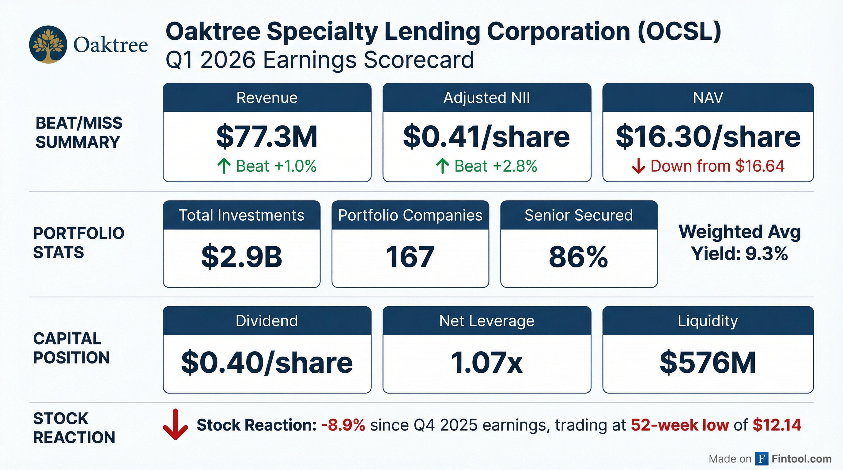 - OCSL reported Adjusted Net Investment Income of $0.41 per share for Q1 2026, which fully covered its declared quarterly cash dividend of $0.40 per share.