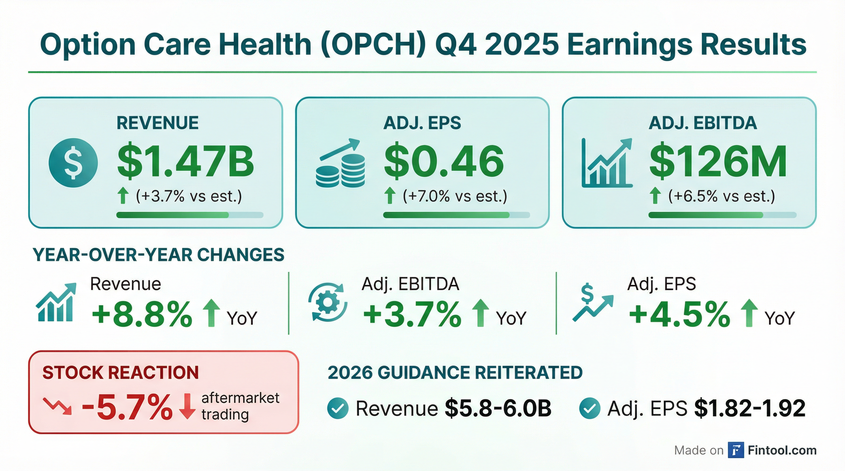 - Option Care Health reported net revenue of $5.6 billion for full year 2025, a 13% increase over the prior year, with adjusted EBITDA of $471 million and adjusted diluted EPS of $1.72.