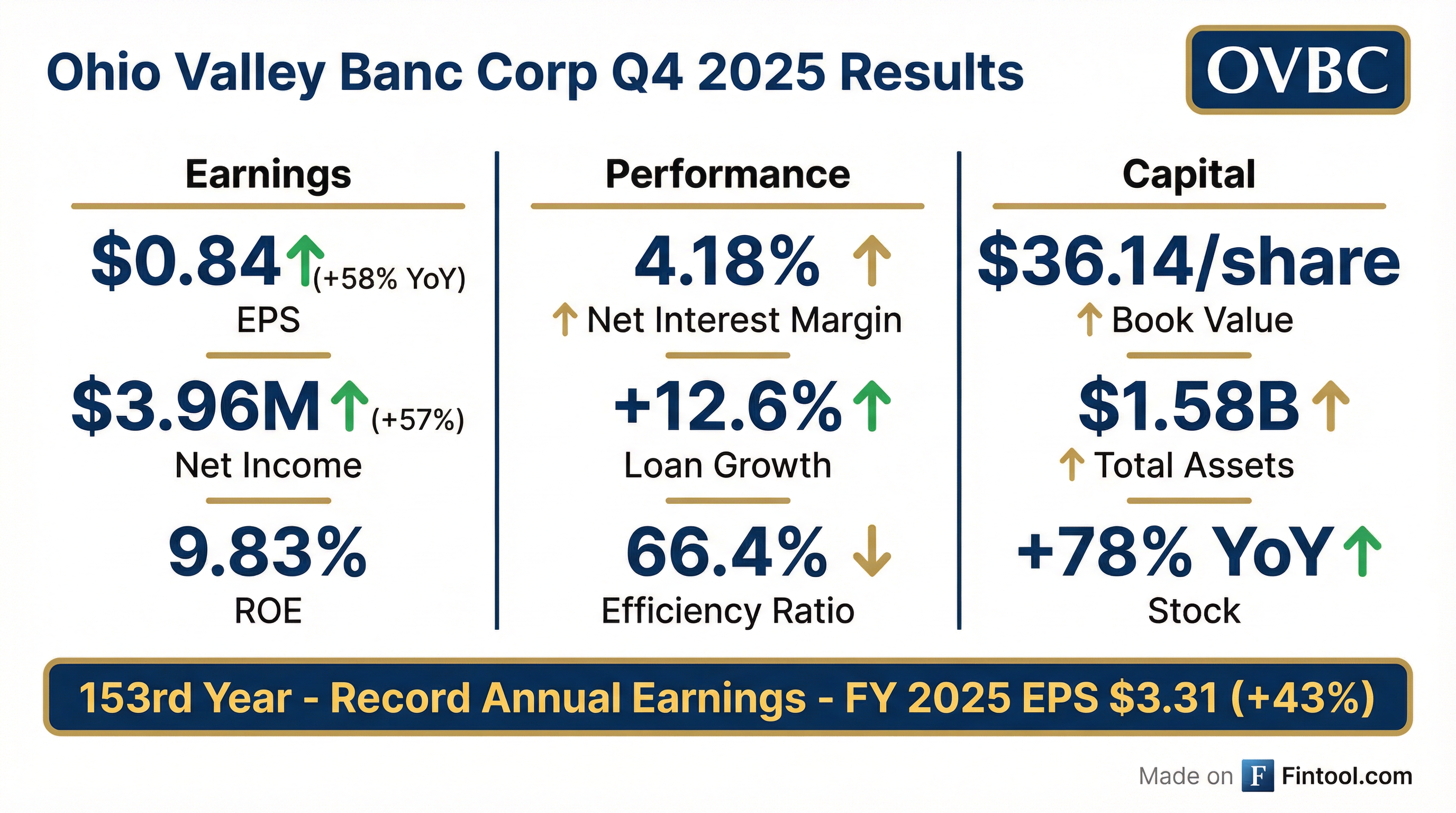 - Ohio Valley Banc Corp. reported record net income of $3,955,000 for the fourth quarter of 2025, a 57.3% increase from the prior year, with earnings per share of $0.84. For the full year 2025, net income totaled $15,601,000, up 41.8%, and EPS was $3.31.