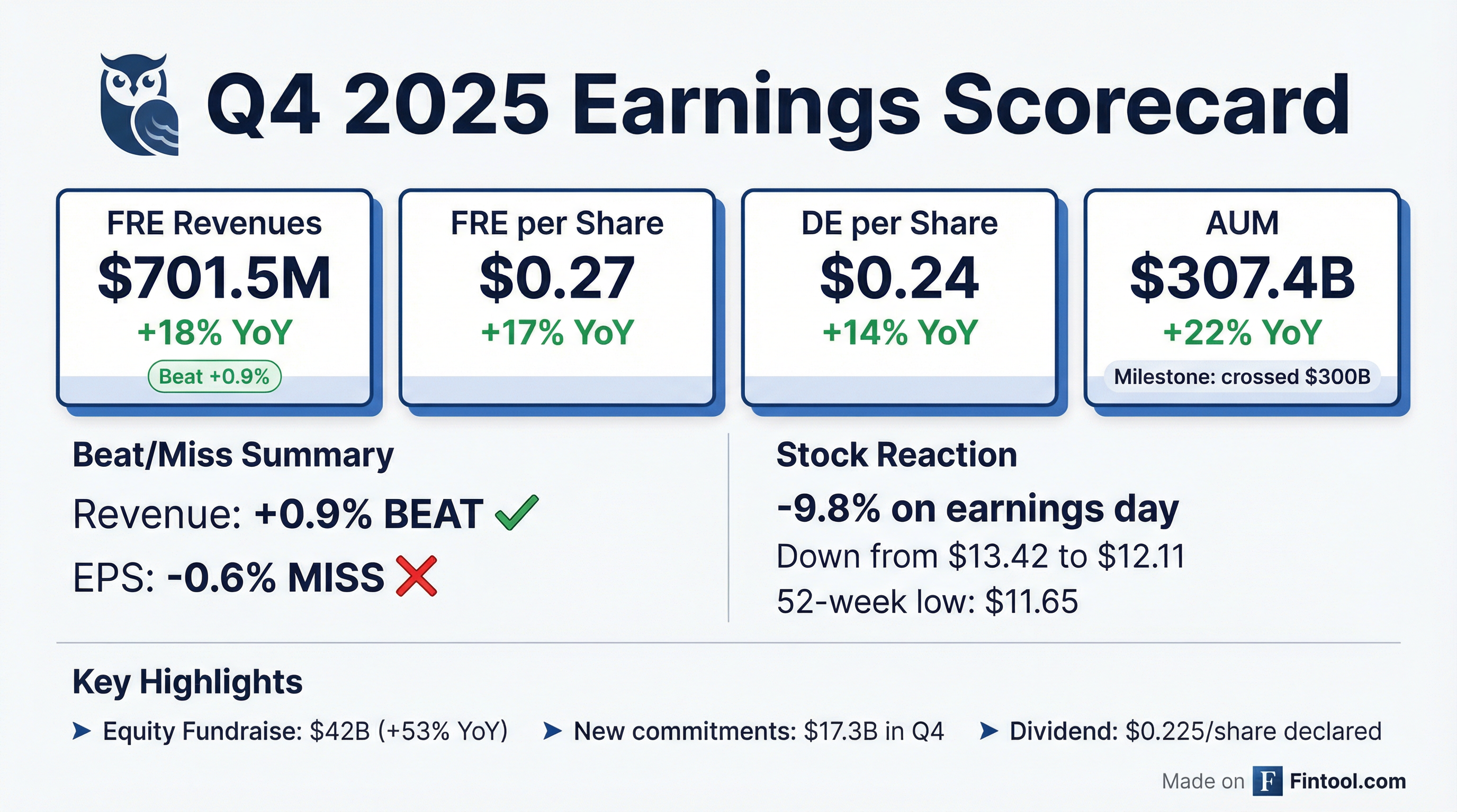 - For Q4 2025, the company reported GAAP Net Income of $47.7 million ($0.07 per diluted Class A Share), Fee-Related Earnings of $416.6 million ($0.27 per Adjusted Share), and Distributable Earnings of $382.5 million ($0.24 per Adjusted Share).