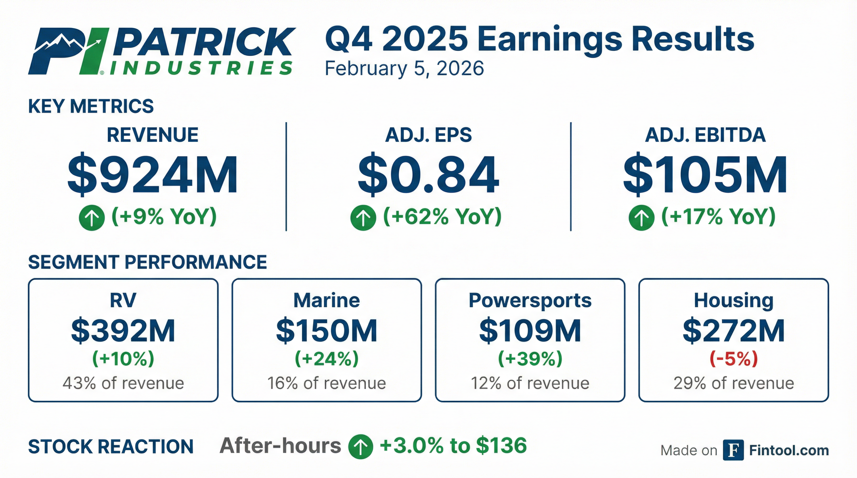 - For Q4 2025, Patrick Industries reported net sales of $924 million, a 9% increase, and Adjusted Earnings Per Diluted Share of $0.84. For the full year 2025, net sales increased 6% to approximately $4 billion, with Adjusted Earnings Per Diluted Share at $4.44.