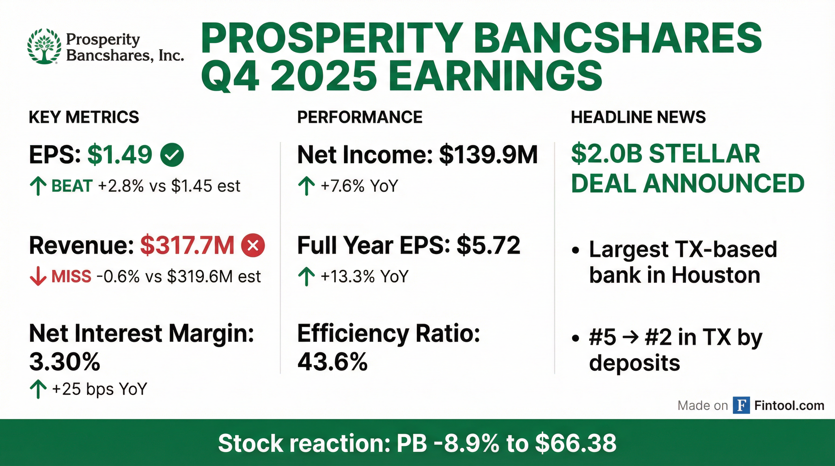 - Prosperity Bancshares reported net income of $543 million and diluted EPS of $5.72 for the full year 2025, marking increases of 13.2% and 13.3% respectively compared to 2024. For the fourth quarter of 2025, net income was $139.9 million, a 7.6% increase from the same period in 2024.