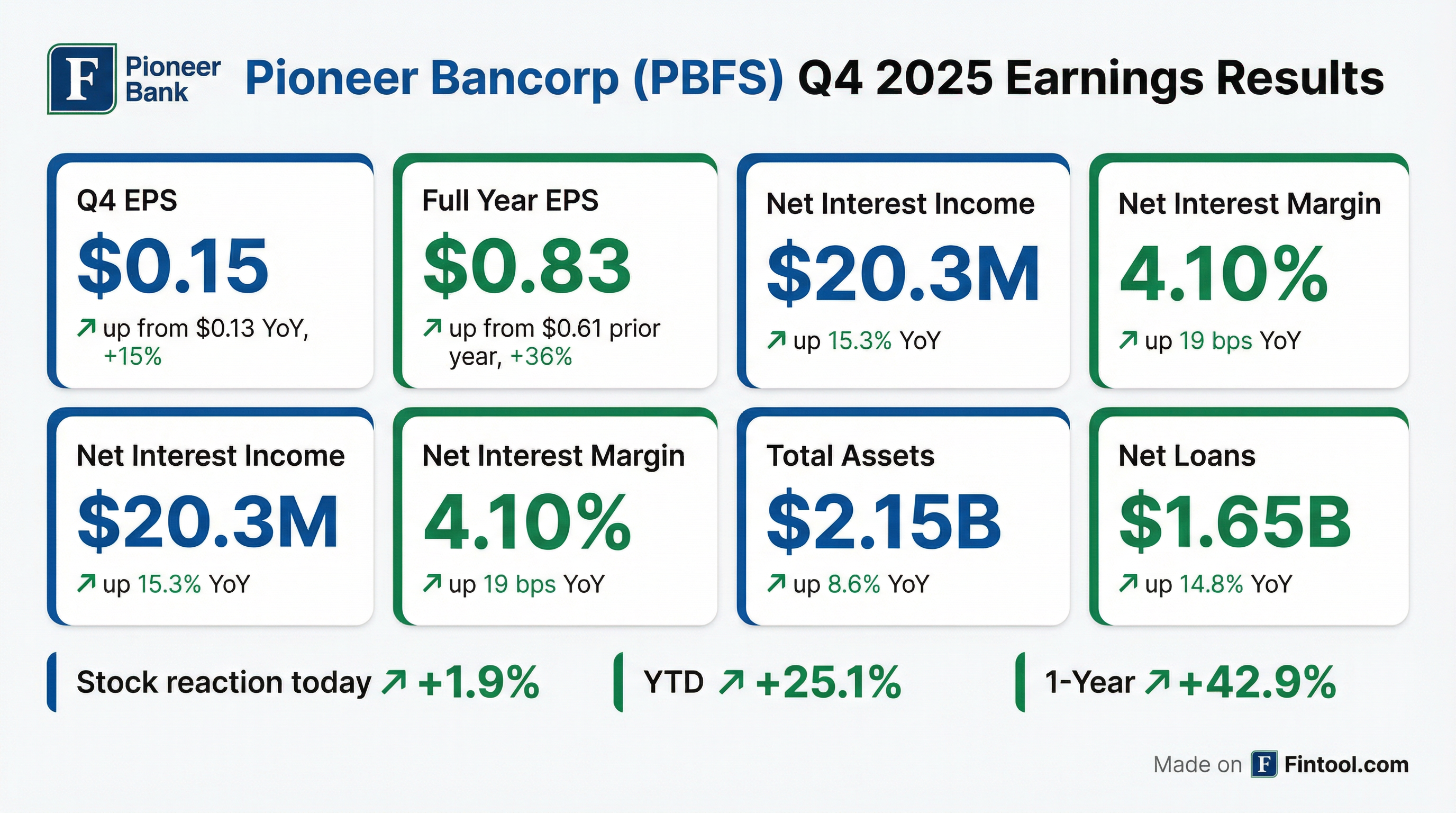• Net income for Pioneer Bancorp, Inc. (PBFS) was $3.7 million for the three months ended December 31, 2025, and $20.3 million for the calendar year ended December 31, 2025, resulting in diluted EPS of $0.15 and $0.83, respectively.