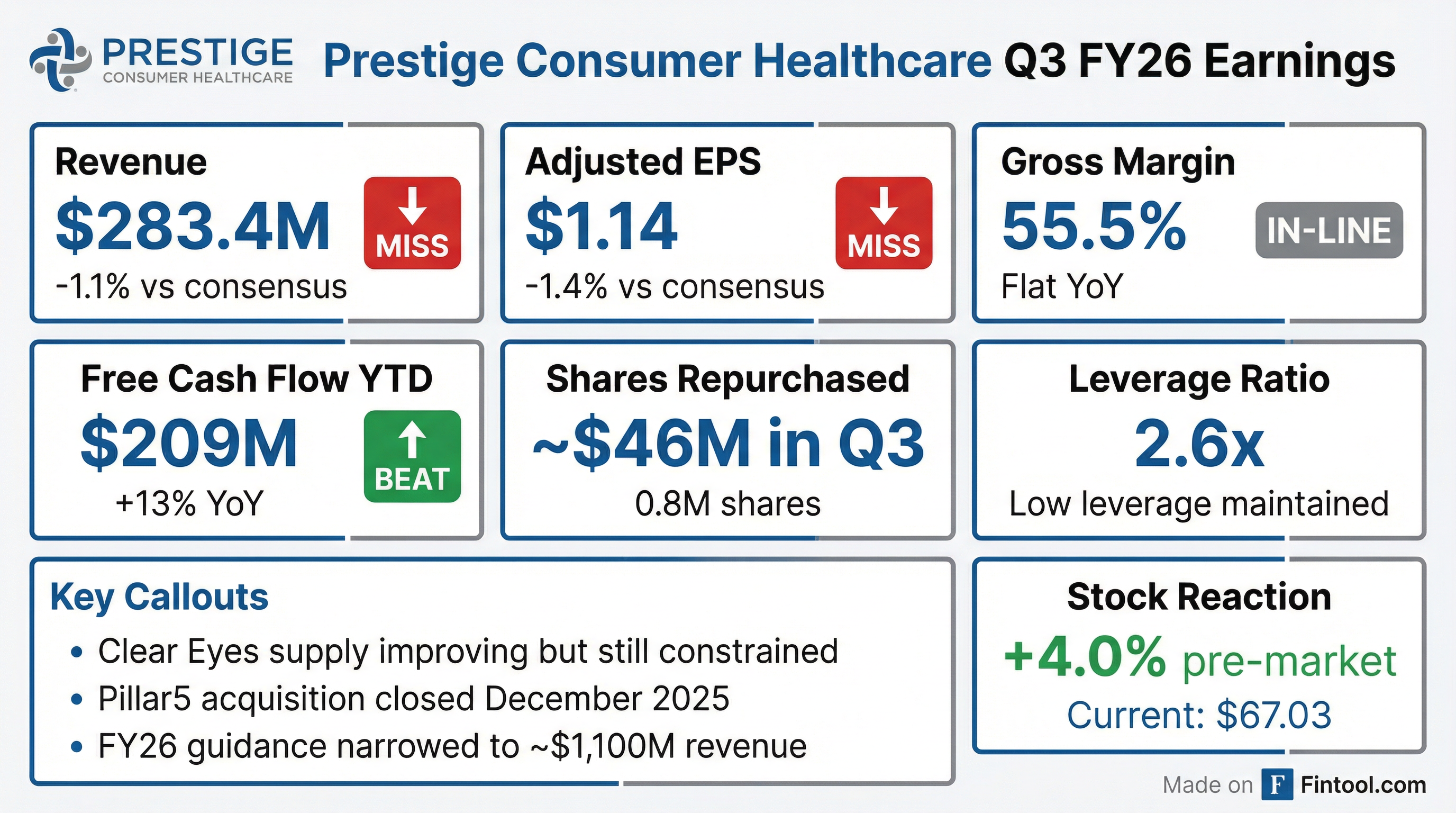 - Prestige Consumer Healthcare reported Q3 Fiscal 2026 revenue of $283.4 million and adjusted diluted EPS of $1.14, with revenue decreasing 2.4% from the prior year.