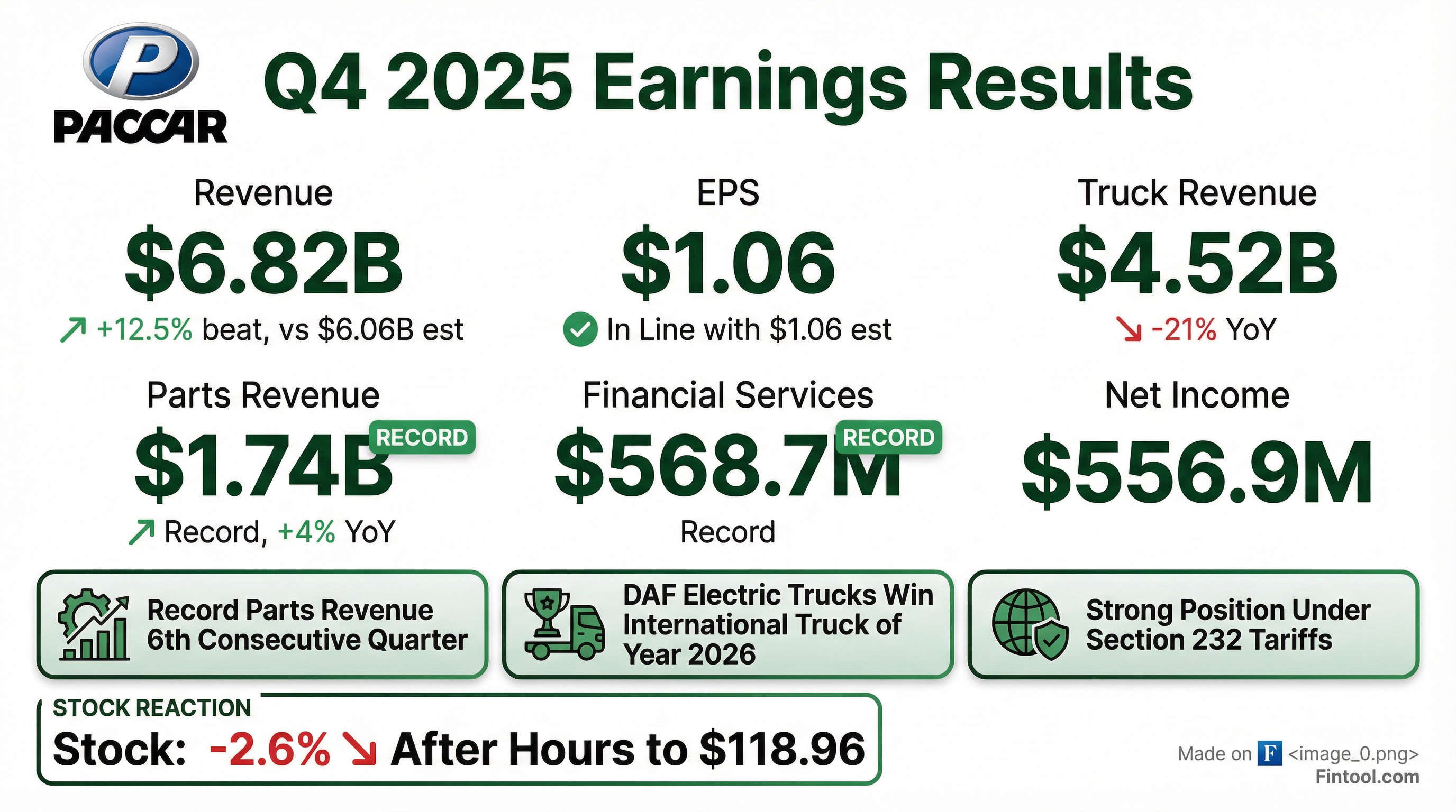 - PACCAR Parts posted Q4 revenues of $1.7 B (+4%; pre-tax profit $415 M) and record FY revenues of $6.9 B (+3%; pre-tax $1.67 B), while PACCAR Financial recorded Q4 revenues of $569 M and pre-tax income of $115 M (FY rev $2.2 B; pre-tax $485 M)