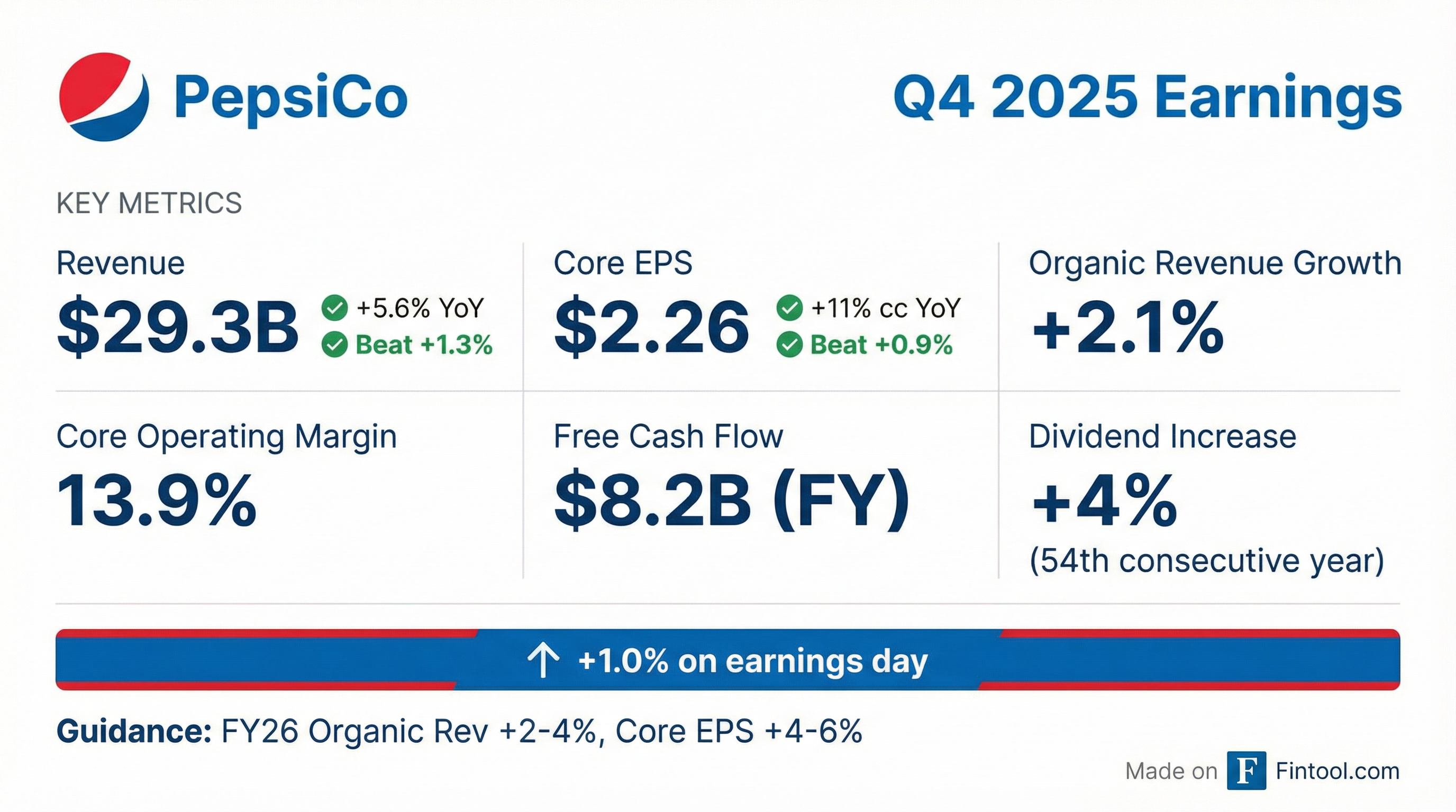 - PepsiCo reported Q4 net revenue +5.6%, organic revenue +2.1%, GAAP EPS $1.85 (+68%) and core EPS $2.26 (+11%)