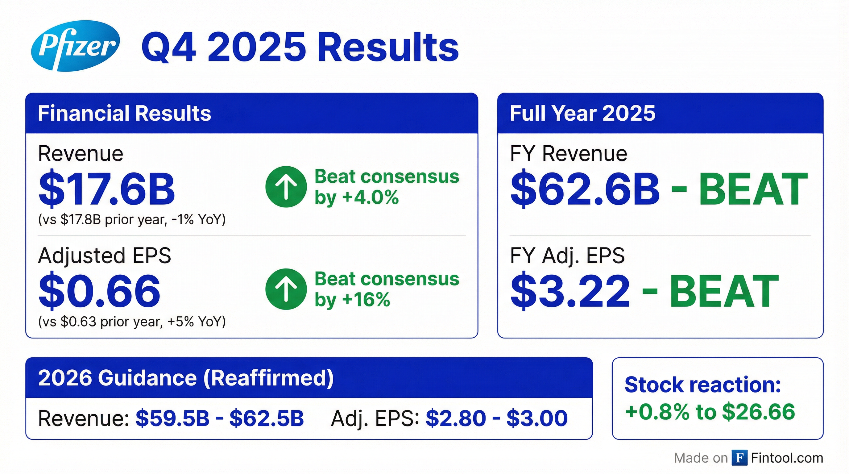 - In Q4 2025, Pfizer generated $17.6 billion in revenue (–3% y/y) and $0.66 in adjusted diluted EPS (+3% y/y).