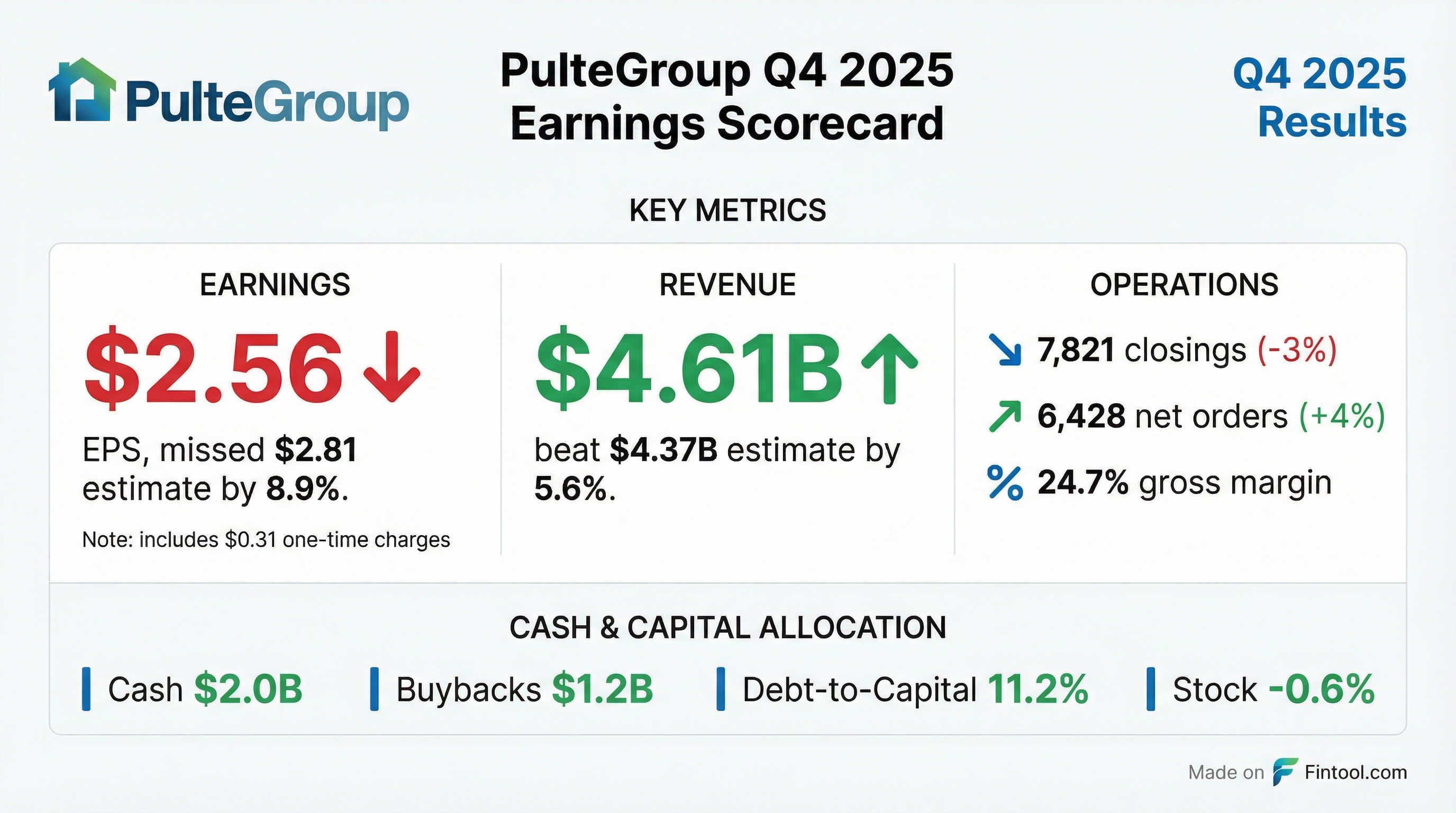 - PulteGroup closed 2025 with home sale revenues of $16.7 billion, gross/operating margins of 26.3%/16.9%, net income of $2.2 billion, and cash flow from operations of $1.9 billion.