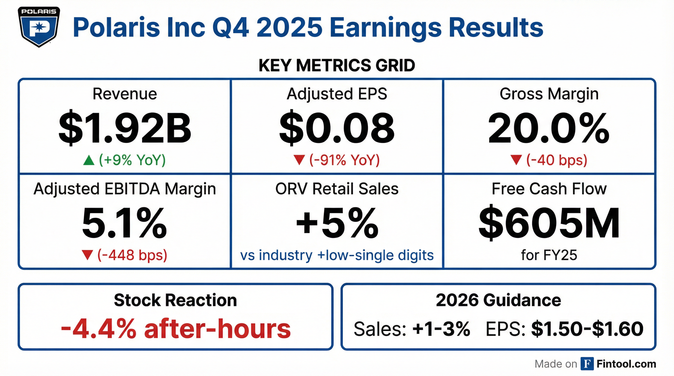 - Polaris reported Q4 2025 adjusted sales growth of 9% and North American retail growth of 9% (excluding youth) , despite a $37 million impact from tariffs on adjusted gross margin , resulting in an Adjusted EPS of approximately $0.08.