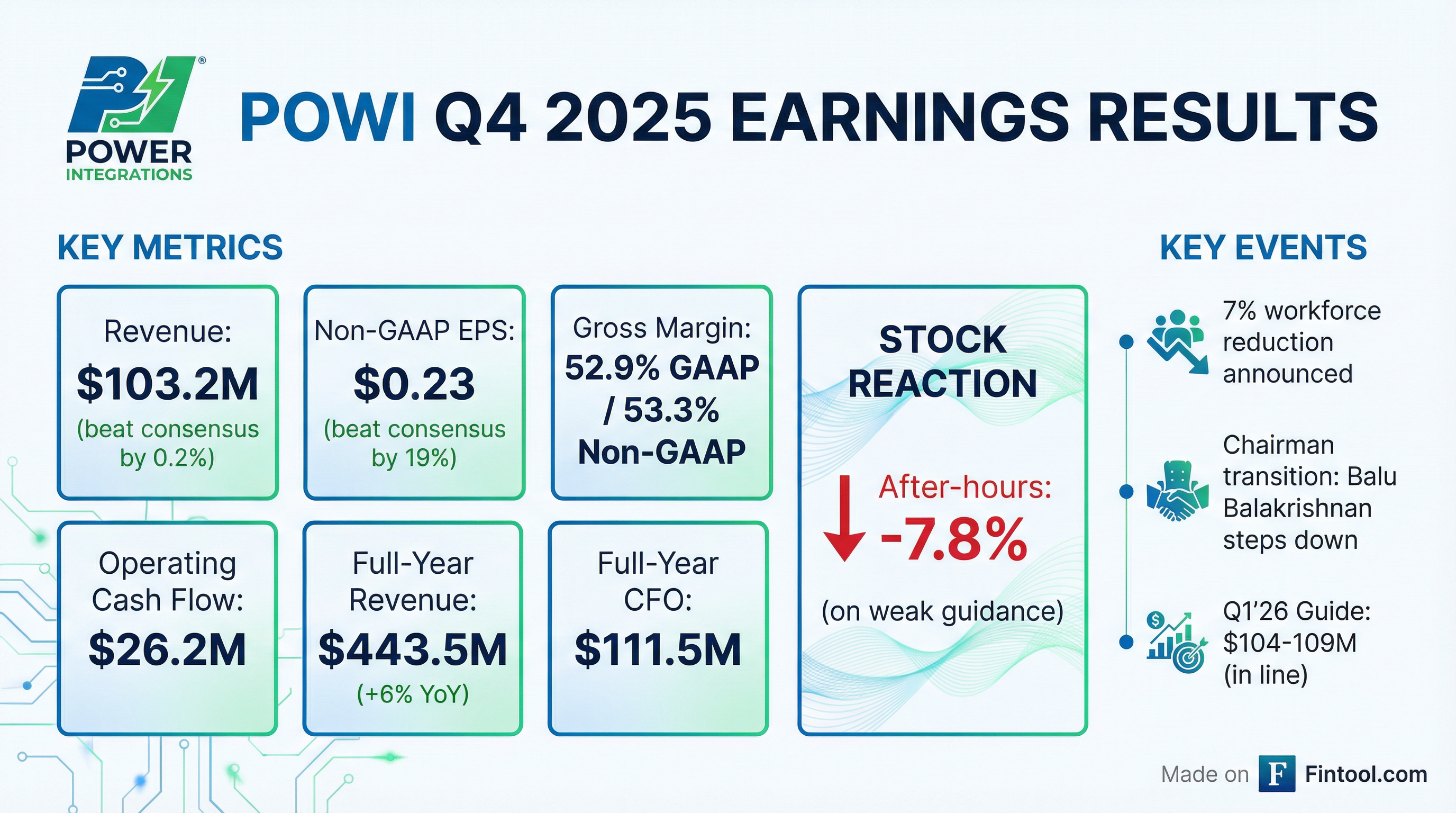 - Power Integrations reported Q4 2025 revenue of $103 million and non-GAAP earnings of $0.23 per share.