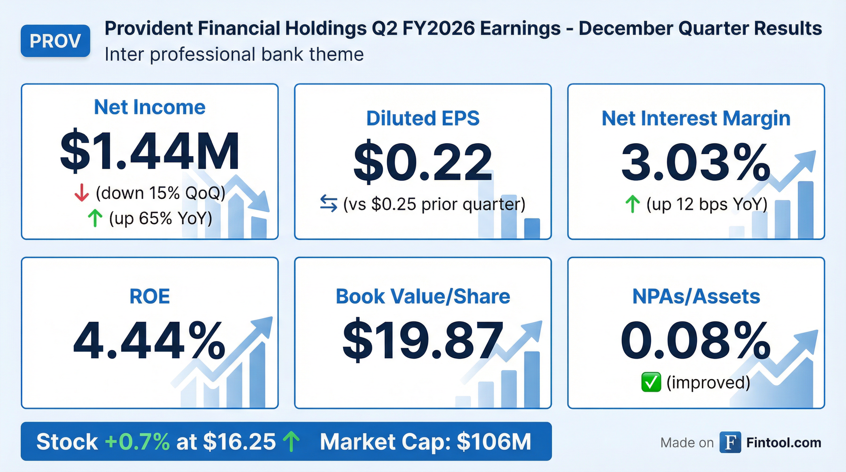 • Provident Financial Holdings, Inc. reported a sequential increase of approximately 3% in Net Income for Q1 FY26 , reaching $1.7 million , with Diluted Earnings Per Share of $0.25.