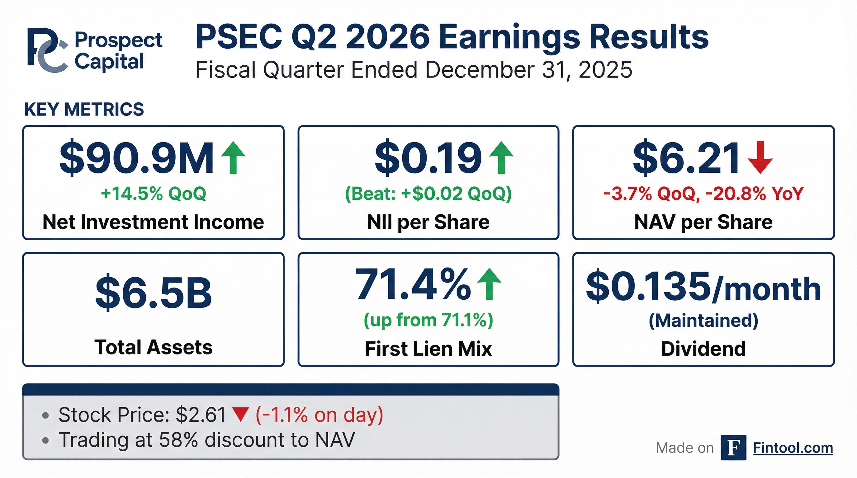 - For Q2 2026, Prospect Capital reported net investment income of $91 million, or $0.19 per common share, and a NAV of $6.21 per common share as of December 31st.