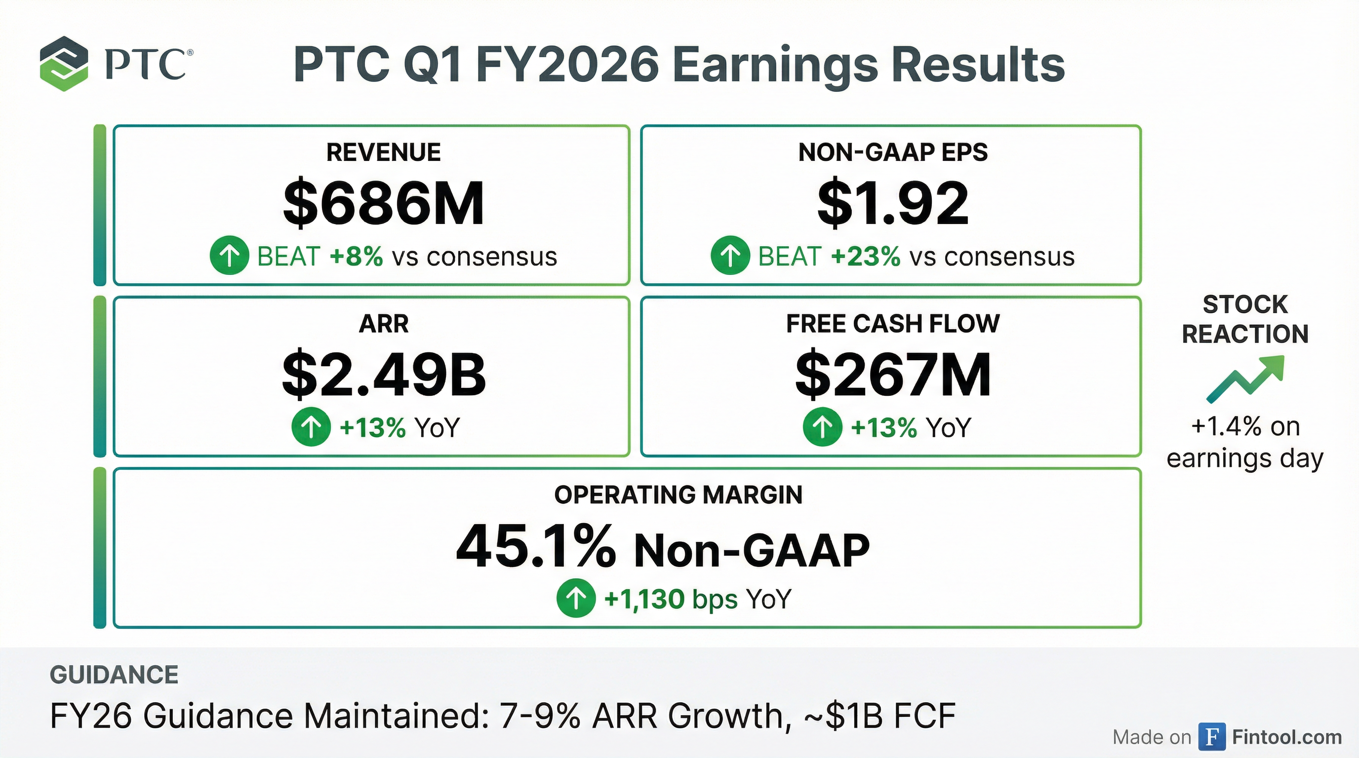 - PTC reports Q1 FY’26 ARR of $2,494 M, up 13% YoY; constant currency ARR excluding Kepware & ThingWorx grew 9.0%, at the high end of guidance