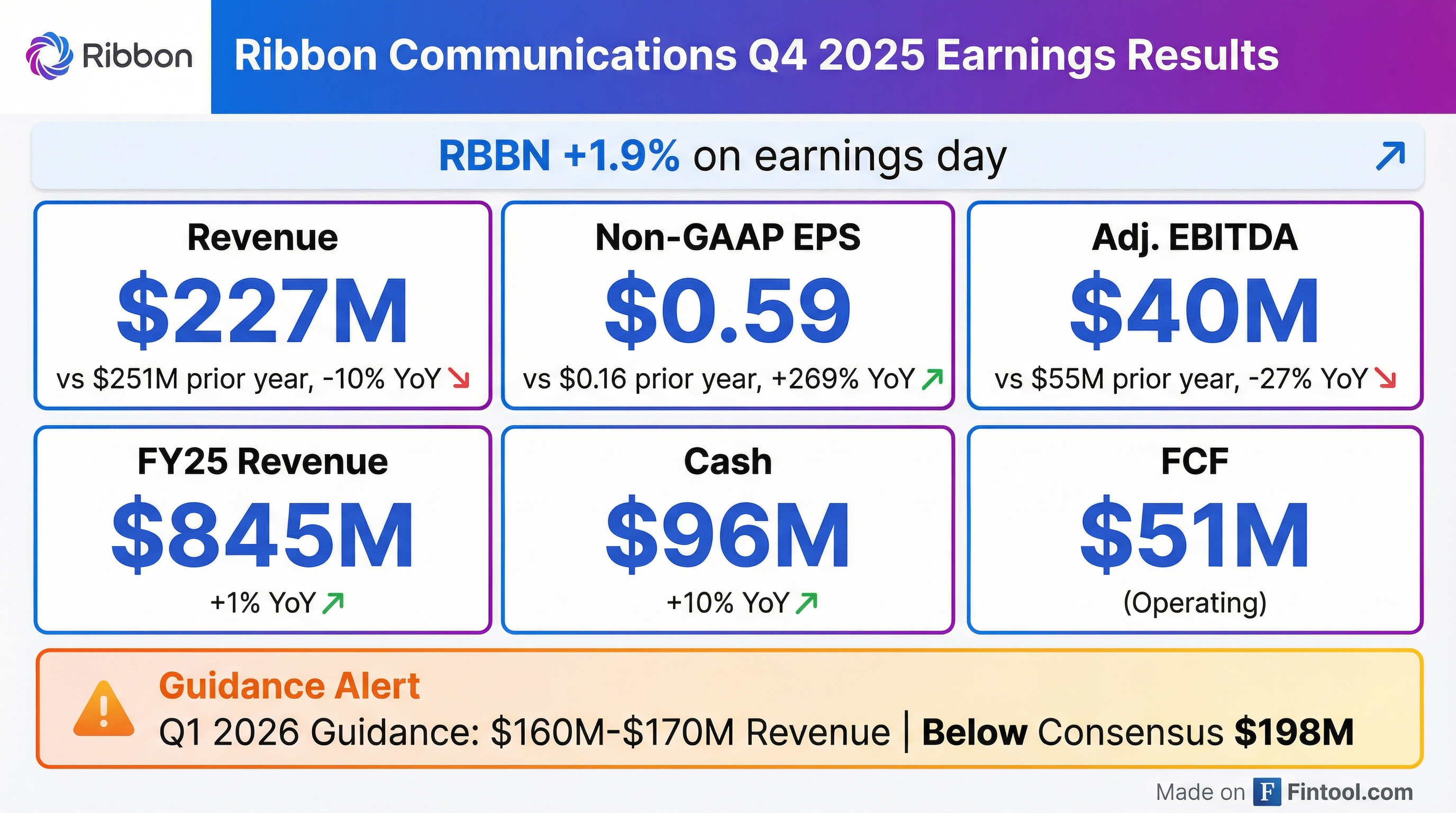 • Ribbon Communications reported Q4 2025 revenue of $227 million, a 10% decrease year-over-year, and full-year 2025 revenue of $845 million, a 1% increase.