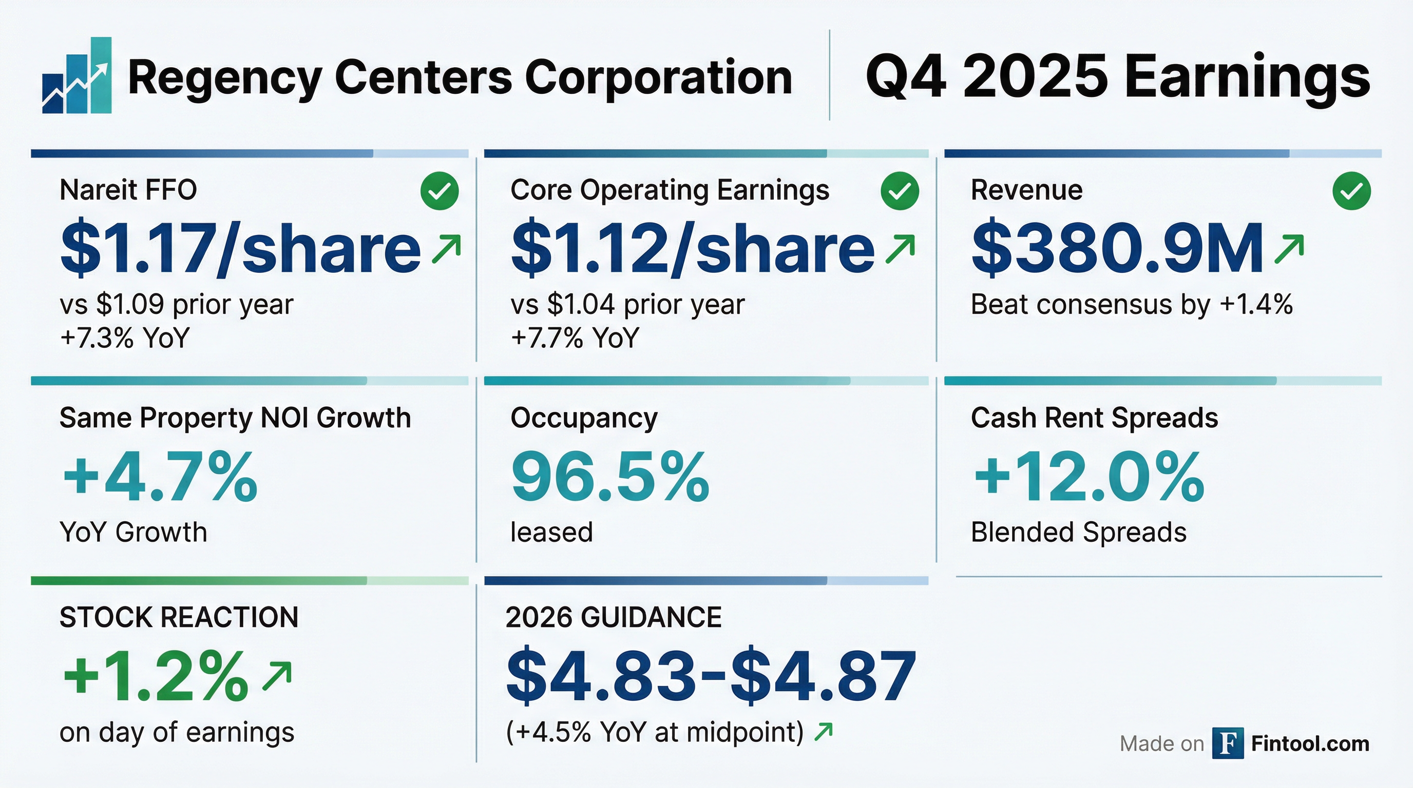 - Regency reported Net Income Attributable to Common Shareholders per diluted share of $1.09 for Q4 2025 (vs. $0.46 in Q4 2024) and $2.82 for FY 2025 (vs. $2.11 in FY 2024).
