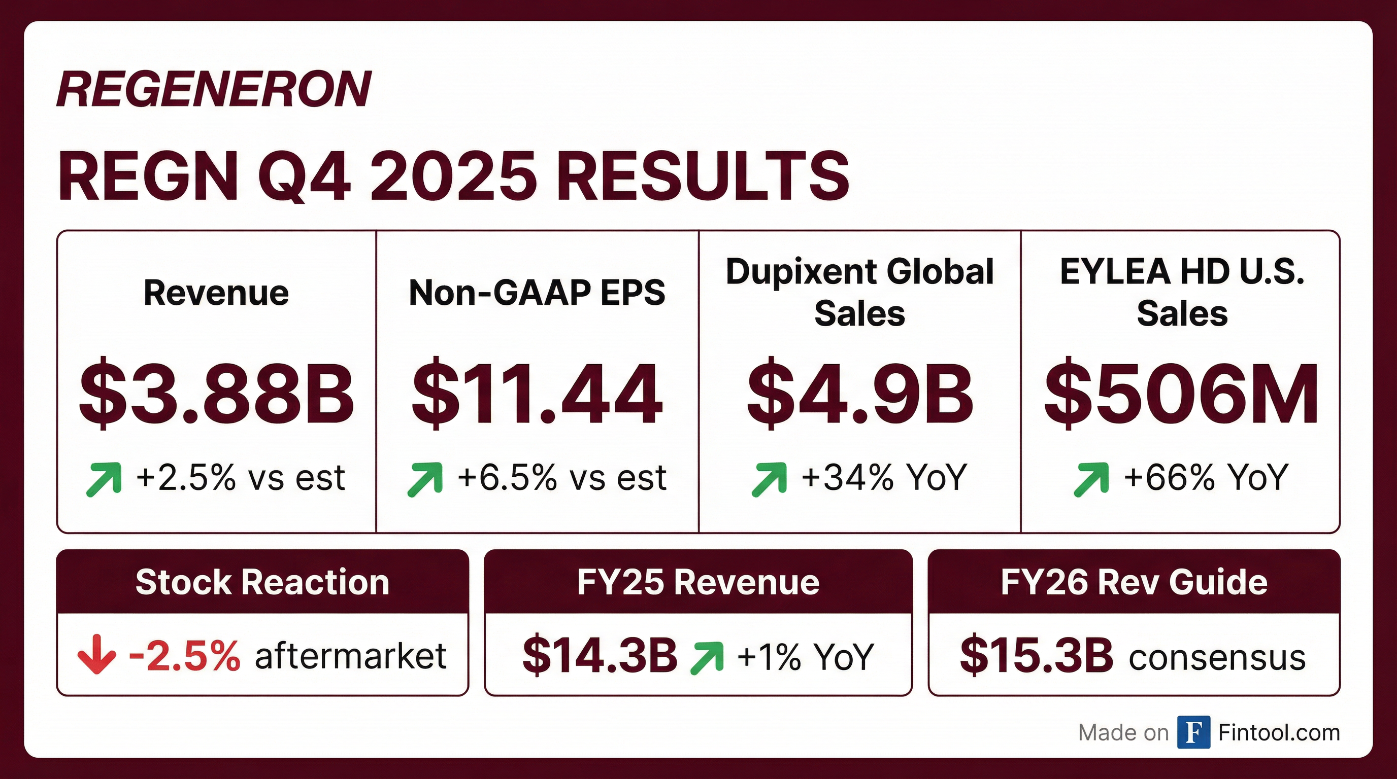- Regeneron posted Q4 2025 total revenues of $3.9 B and non-GAAP EPS of $11.44.