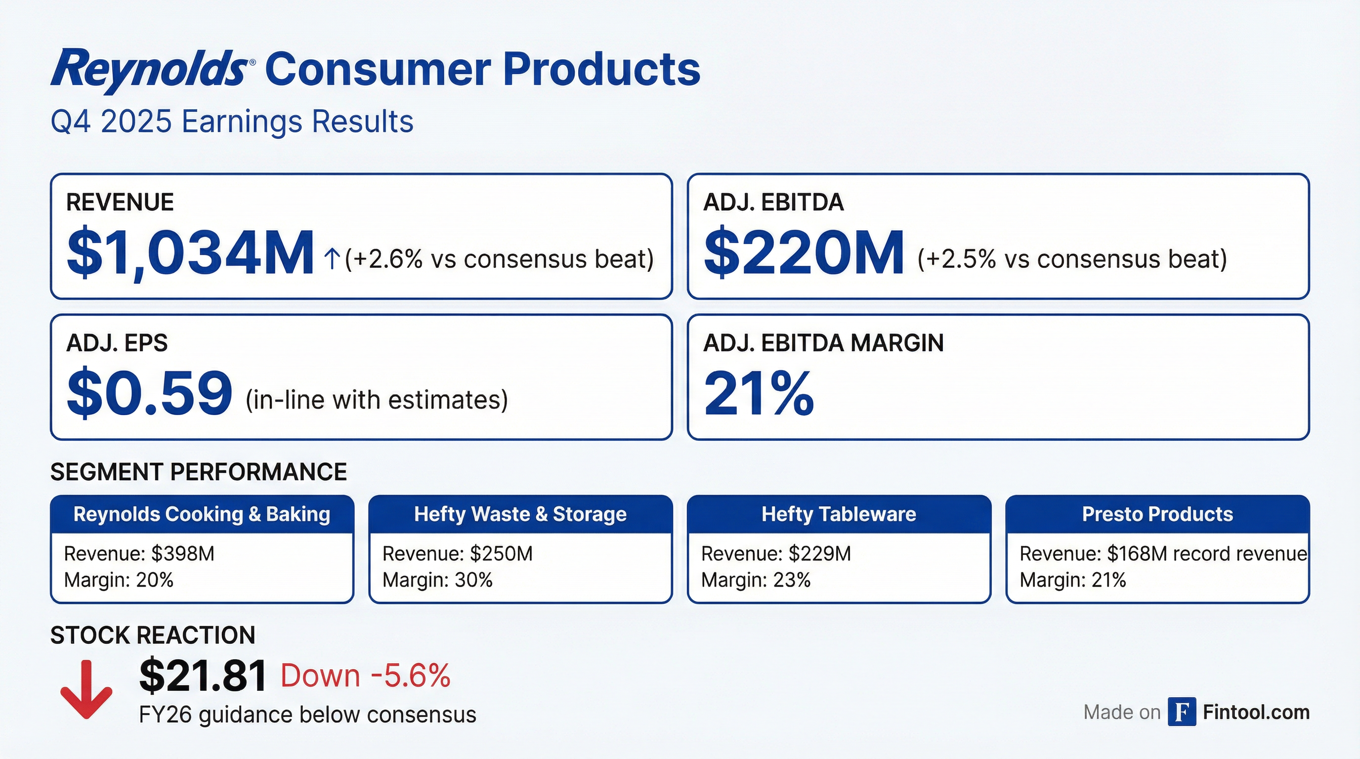 - Reynolds Consumer Products (REYN) reported Q4 2025 Net Revenues of $1,034 million and Adjusted EBITDA of $220 million, achieving an Adjusted EBITDA margin of 21%.