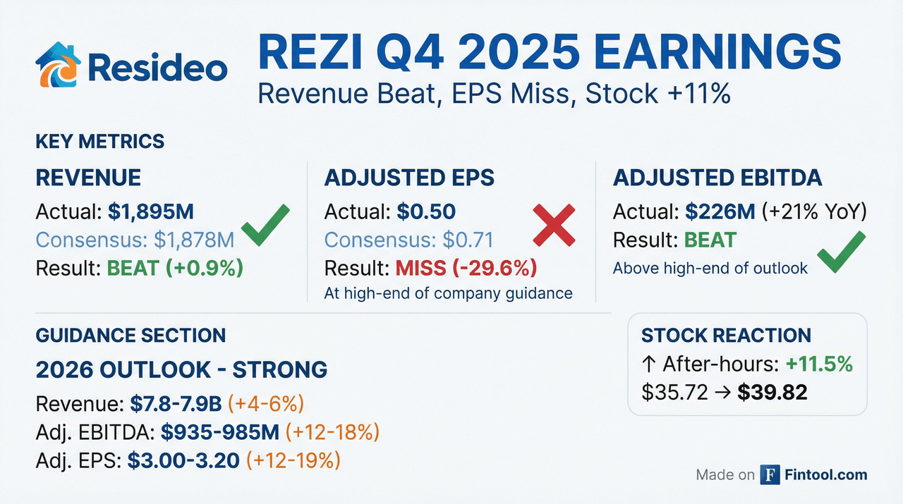 - Resideo Technologies reported FY 2025 Net Revenue of $7,472 million and Adjusted EPS of $2.68, representing year-over-year increases of 11% and 17%, respectively. For Q4 2025, Net Revenue reached $1,895 million and Adjusted EPS was $0.50.