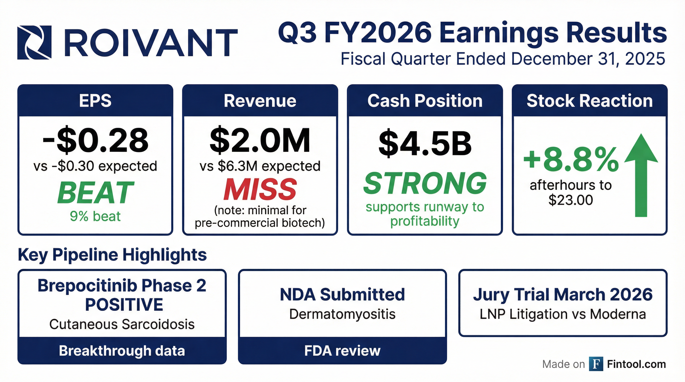 - Roivant reported consolidated cash, cash equivalents, restricted cash, and marketable securities of $4.5 billion as of December 31, 2025, supporting cash runway into profitability. For the third quarter ended December 31, 2025, the company recorded a net loss attributable to Roivant Sciences Ltd. of $(265.891) million and revenue of $1.999 million.