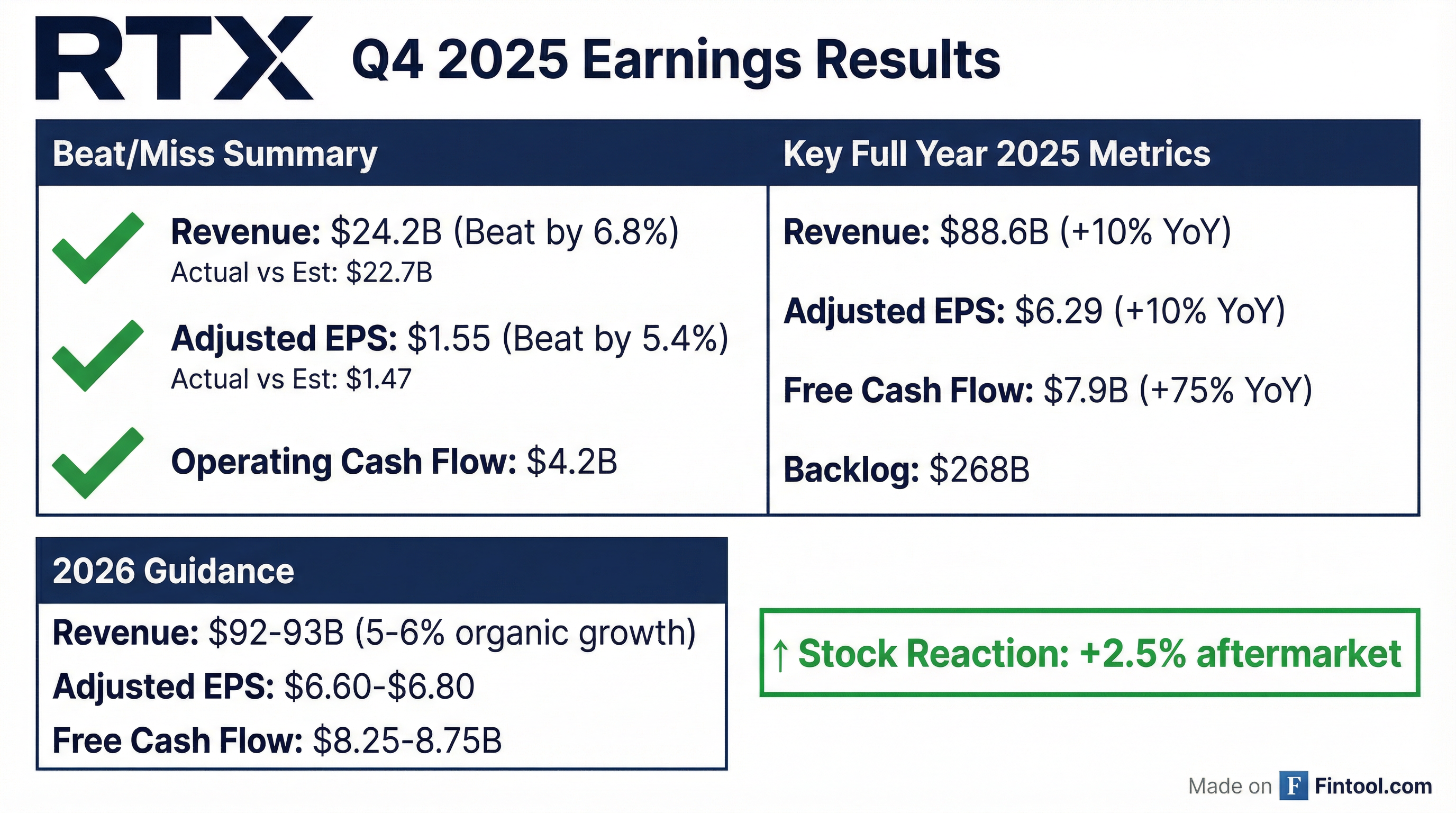 - For FY 2025, RTX achieved $88.6 billion in adjusted sales (11% organic growth), $6.29 adjusted EPS (10% YoY increase), and $7.9 billion in free cash flow, while ending the year with a record backlog of $268 billion (book-to-bill 1.56).