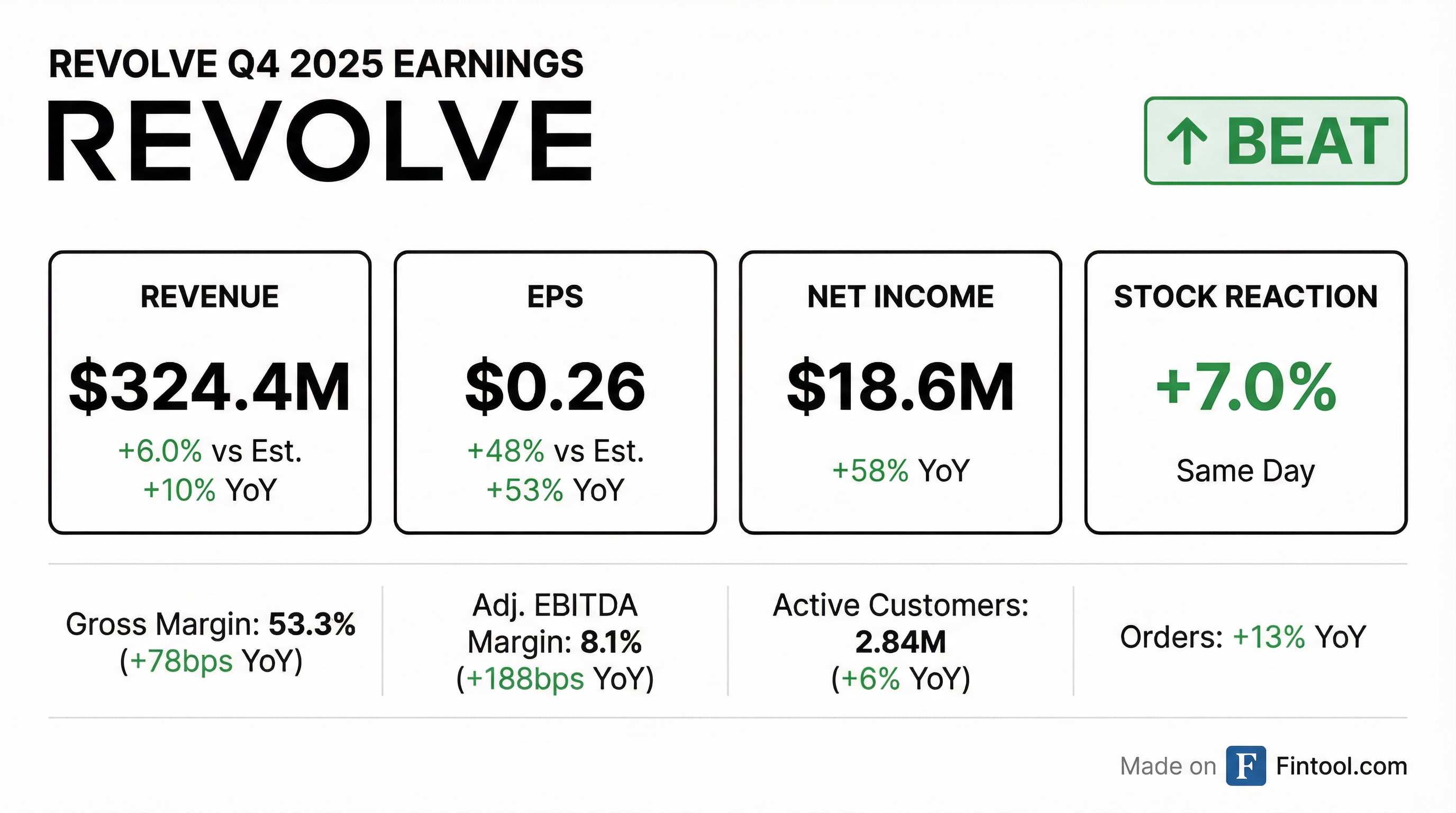 - Revolve Group, Inc. reported robust financial performance for Q4 2025, with net sales increasing 10% year-over-year to $324.4 million, net income rising 58% to $18.6 million, and Adjusted EBITDA growing 44% to $26.3 million.
